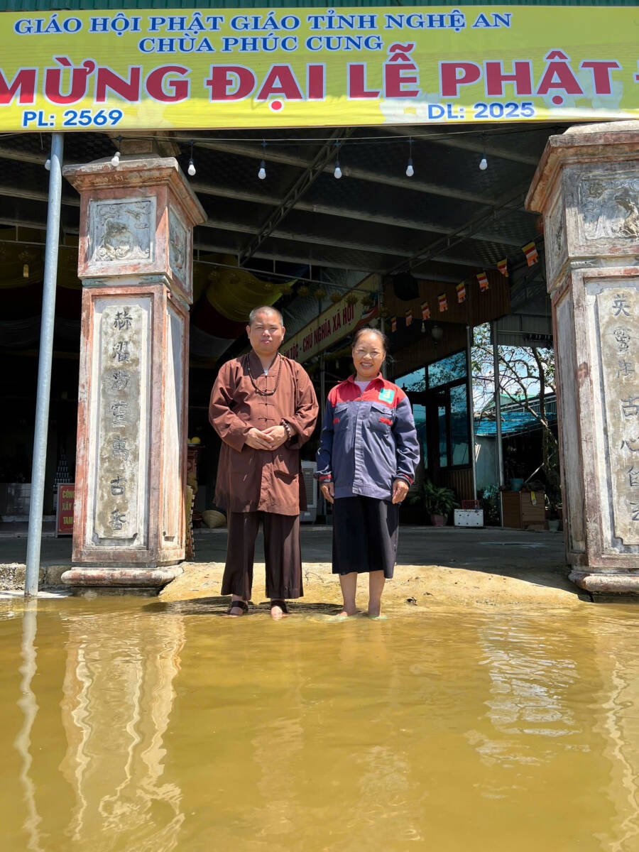 Tiếp đến đoàn ghé thăm Chùa Long Hoa ở xã Hưng Long cũ. Mặc dù cao hơn nhưng sáng nay nước mới rút, tranh thủ chư Tăng và Phật tử quét dọn được chính điện và nhà Tổ. Gần trưa, Đoàn sang 9 Lam thăm chùa Phúc Cung ở xã Nam Phúc cũ vẫn còn nước ngập gần 1 km nữa, nên đoàn phải lội bộ vào; đây là vùng chiêm trũng và có nhiều đỉa khi nước dâng lên. Nghe Phật tử lắng lòng giãi bày tâm sự: “Mấy bữa ni ở đây lụt quá không có gì ăn uống cả, chỉ có lộc kẹo bánh cúng từ rằm tháng bảy thôi. Sáng ni nước xuống đỡ, sư cô (Thích Quảng Tịnh – Trụ trì chùa) lội ra quãng tê, có xe mô đi bên Đức Thọ qua đón lặn lội ra Diễn Châu để có Phật tử cho ít gạo và rau đem về, mà đường xá trục trặc răng giờ chưa thấy về (11h45’). Khổ lắm các Thầy ơi, chùa giữa cánh đồng mênh mông là nước gì cả, chả có ai đến. Hôm nay, các Thầy đến thăm động viên, lại cho quà chúng con cảm động quá. A Di Đà Phật”.