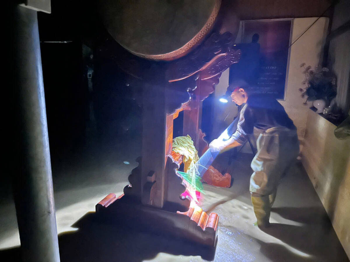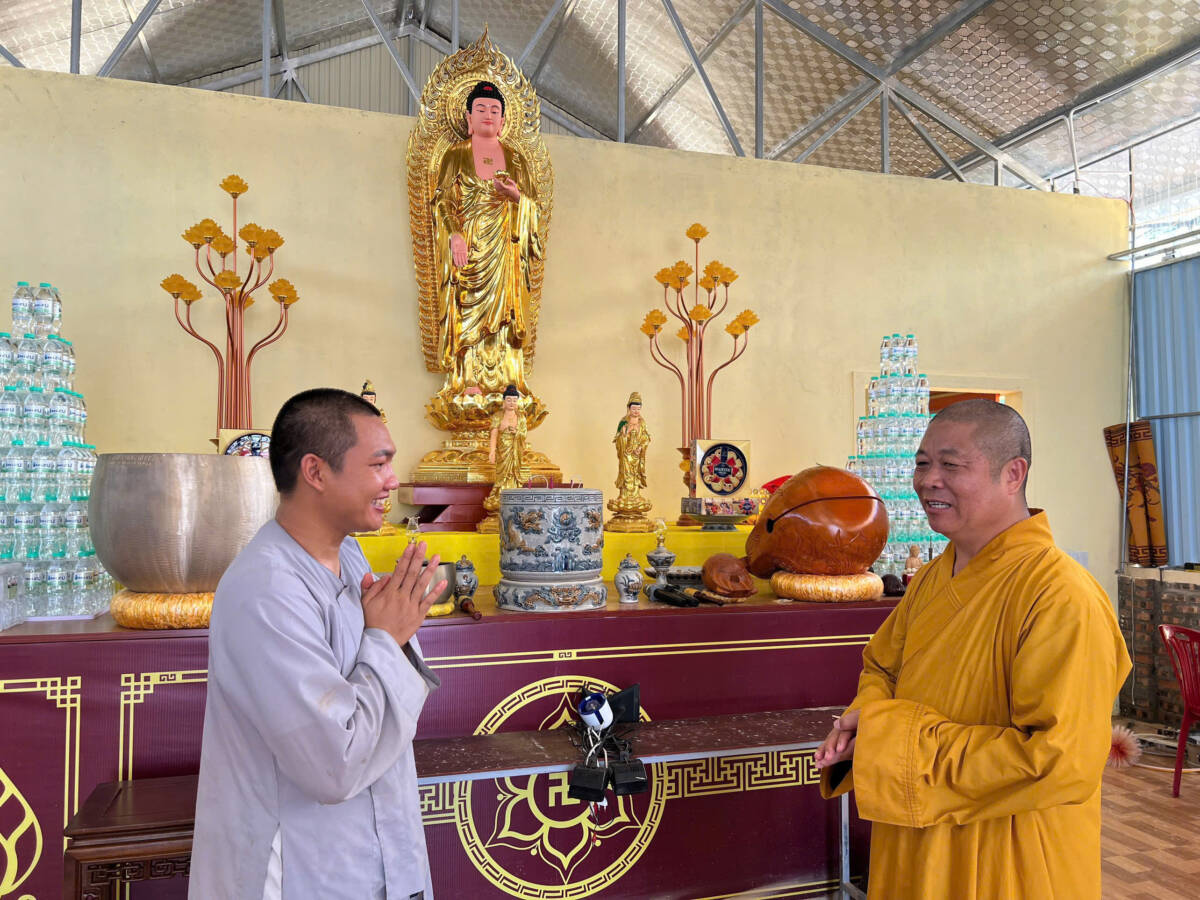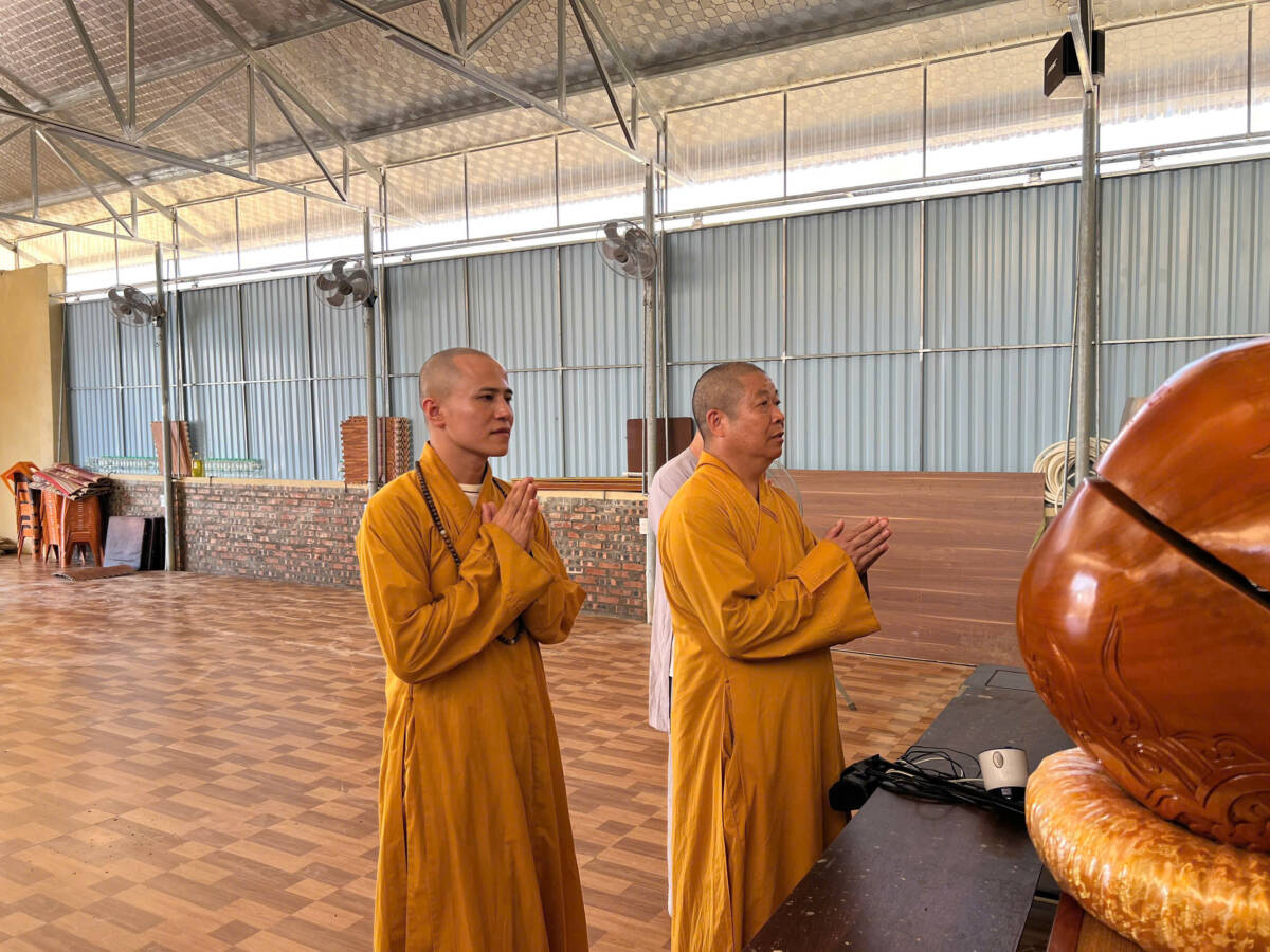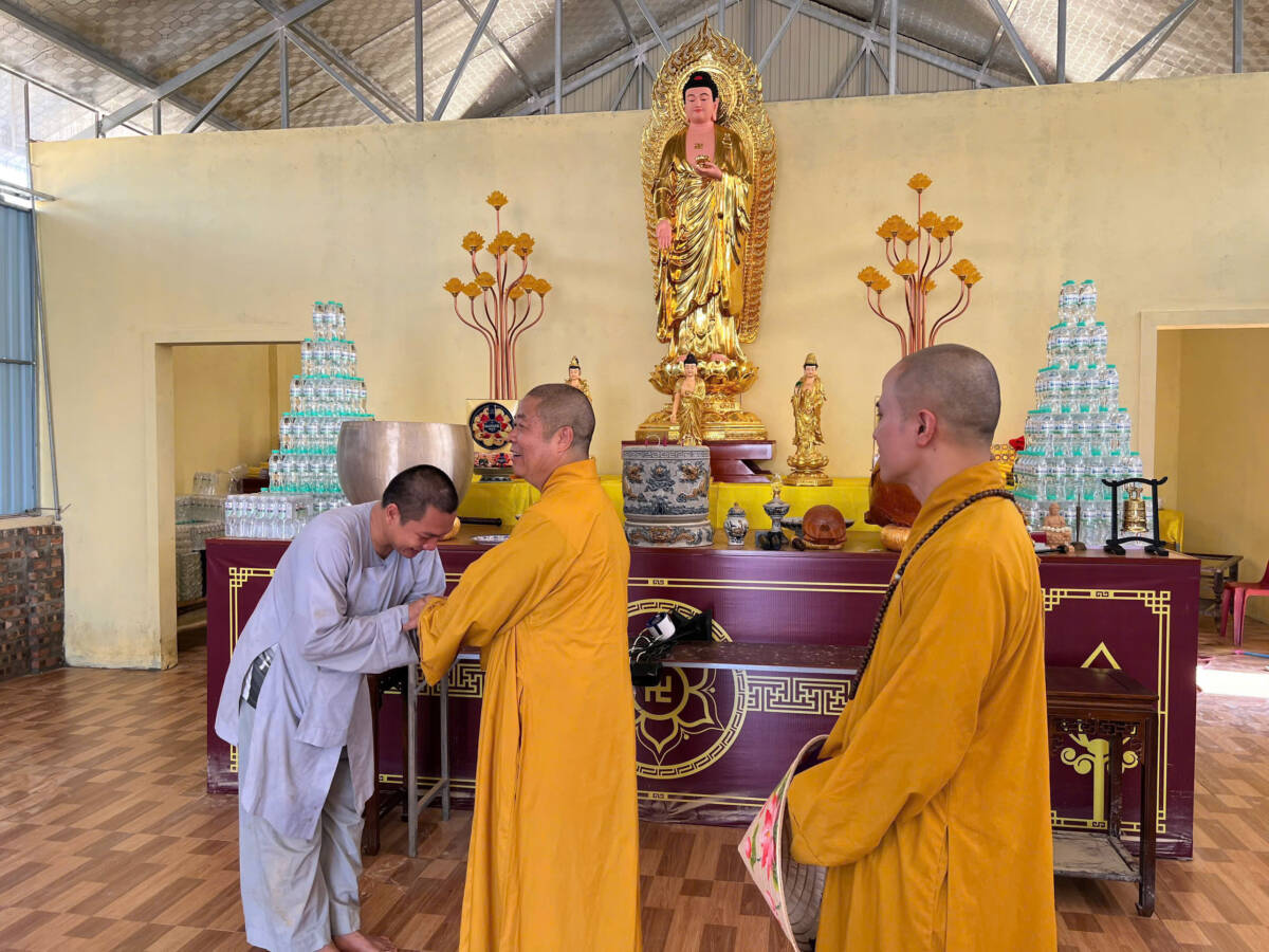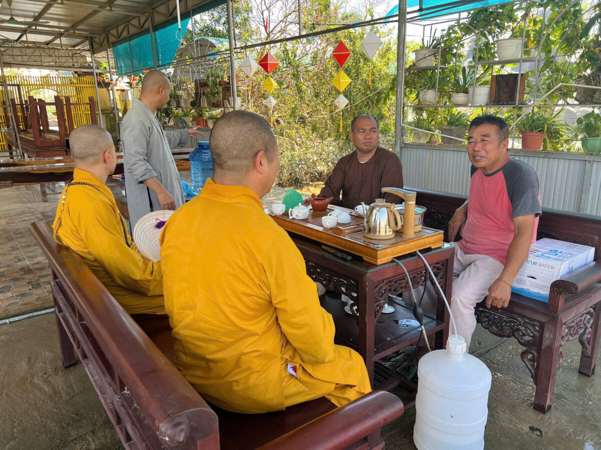 Đoàn đến thăm Chùa Phúc Thành ở xã Hưng Châu cũ, Đại đức Thích Định Tuệ – UVTT BTS, Trưởng Ban TTTT GHPGVN tỉnh, Trụ trì Chùa bộc bạch: “Chúng con may mắn hơn ở chùa ngay chân đê, mặc dù bị bão tốc nhà, đổ tượng nhưng vẫn cố gắng vượt qua khắc phục, rồi tạm gác lại để đi vận động các mạnh thường quân ủng hộ các nơi bị ngập sâu hơn. Sáng nay vừa đi bên xã Nam Cường cũ, nghe Thầy Minh Hải (Chánh Văn phòng Tỉnh hội) gọi điện có Hòa thượng Phó Thường trực và Quý Thầy trong Ban Trị sự đến thăm, con rất cảm động bùi ngùi nên phát quà xong chạy gấp về đây để đón Đoàn ạ!”.