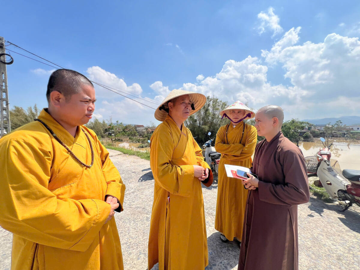 Tháp tùng có Đại đức Thích Châu Phong – Phó Chánh Thư ký Tỉnh hội, Trưởng Ban Pháp chế GHPGVN tỉnh; Đại đức Thích Minh Thanh – UV BTS, Phó Chánh Văn phòng GHPGVN tỉnh; Đại đức Thích Tâm Duệ – UVTT Ban Văn hóa GHPGVN tỉnh. Đoàn đã đến thăm Chùa Phúc Tài ở xã Hưng Lợi cũ, lắng nghe Sư cô Thích Chơn Tuệ – Trụ trì Chùa bộc bạch: “Hiện nay mặc dù đã qua 1 tuần của cơn bão số 10 nhưng mực nước Sông Lam vẫn dâng cao, các phương tiện chưa thể vào chùa được nên chúng con vẫn phải ở tá túc nơi chân đê nhà Phật tử, mong trên Hòa thượng, cùng quý đại đức đánh chữ đại xá cho chúng con chèo đò ra đây. Mấy ngày nay, chúng con và bà con vùng này chỉ có xin nước lọc và dùng mỳ tôm qua ngày thôi”. Đoàn đến Chùa Long Đồng ở xã Hưng Nhân, cách bờ đê khoảng hơn 2km gần Sông Lam vượt qua nhiều đoạn vẫn còn nước dâng cao và bùn đất lầy lội. Đại đức Thích Phúc Thuận, cùng Phật tử đang lau sàn nhà chính điện vẫn còn bùn, vội tâm sự trong nghẹn ngào: “Chúng con cảm động quá, từ hôm bão tới giờ, nơi đây vùng nước dâng cao 2m, tâm điểm xoáy lũ không ai dám đến. Ngày nay được Hòa thượng cùng Quý Thầy thương tưởng đến thăm, thật là diễm phúc cho chúng con. Có những hôm phải trèo lên nóc nhà để ở, mà đến hôm nay nơi đây vẫn còn mất điện mất sóng và không có nước sinh hoạt Hòa thượng ạ!”.