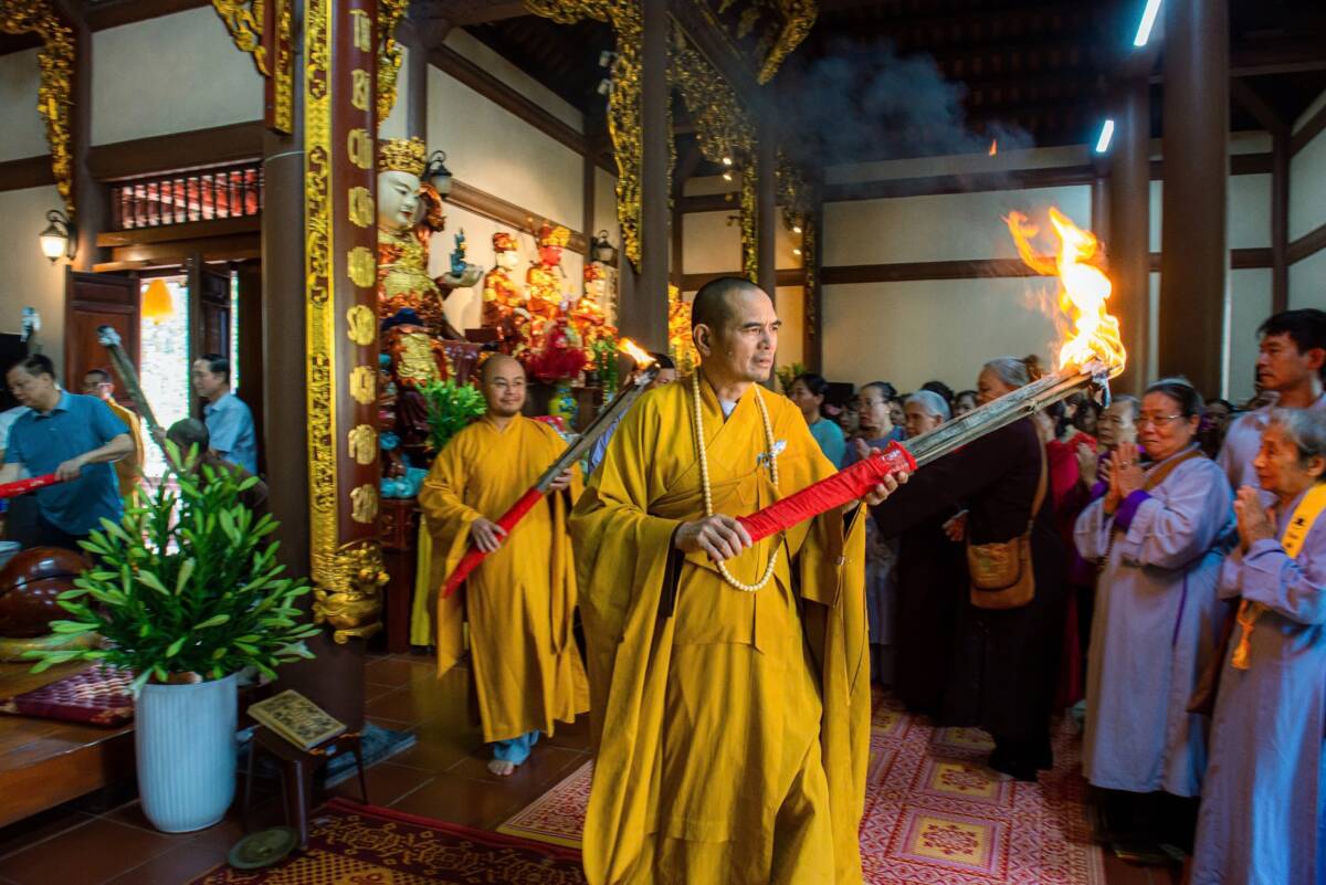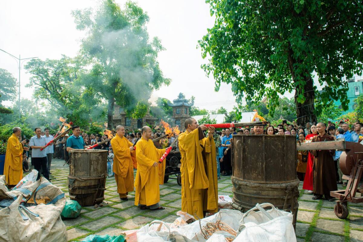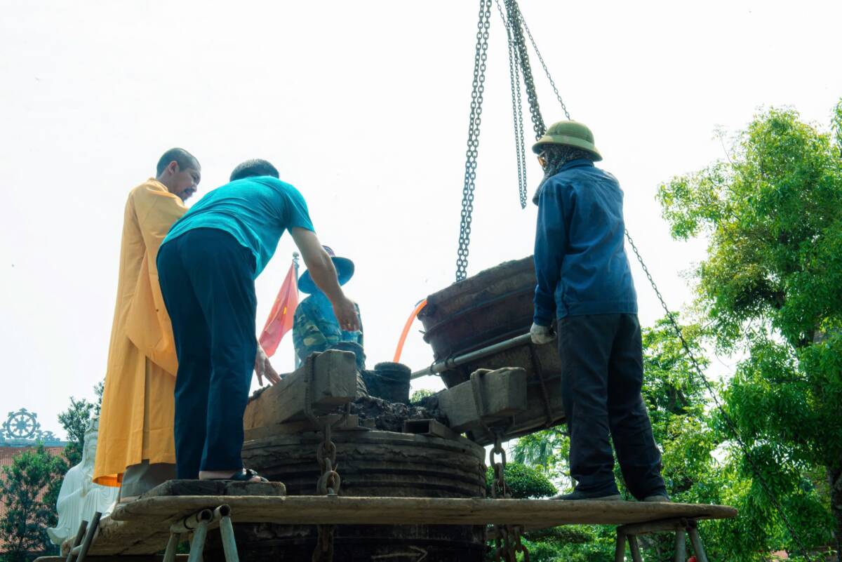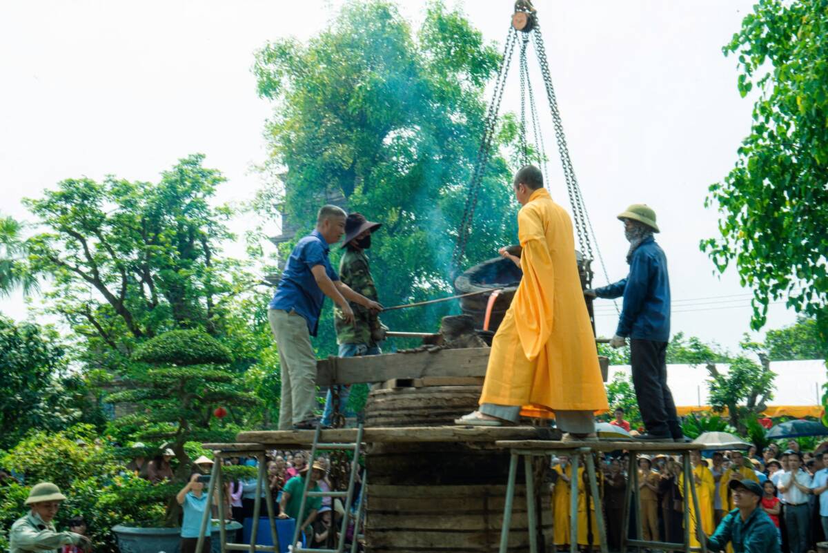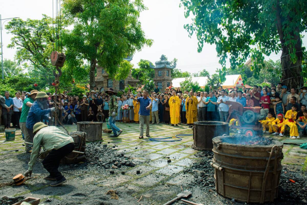 Đỉnh điểm của buổi lễ là nghi thức châm lửa – rót đồng đúc đại hồng chung. Ngọn lửa thiêng được khai mở trong sự chú nguyện của chư tôn đức. Trong tiếng trì chú trầm hùng, từng mẻ đồng đỏ được nung chảy, ánh lên sắc vàng rực rỡ, rồi được trang nghiêm rót vào khuôn đúc. Khoảnh khắc dòng đồng chảy vào khuôn không chỉ là một công đoạn kỹ thuật, mà còn là biểu tượng của sự kết tinh tâm lực, công đức và niềm tin của Tăng Ni, Phật tử cùng nhân dân.