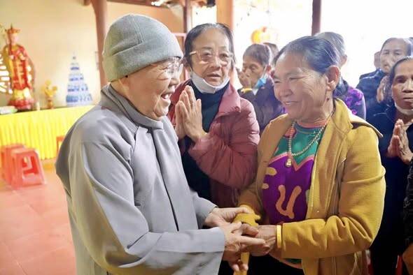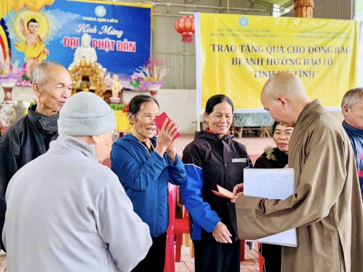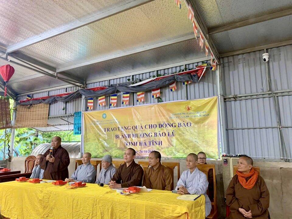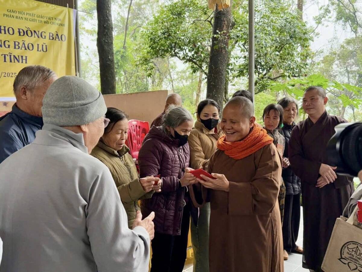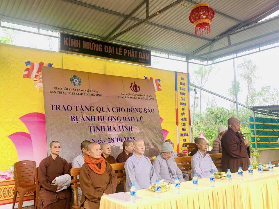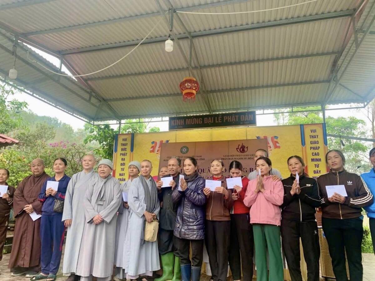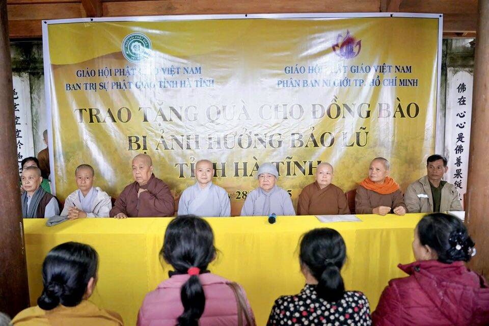 Trong thời gian vừa qua, do ảnh hưởng của 2 cơn bão lớn đổ bộ vào khu vực Bắc Trung Bộ, nhiều hộ dân tại Hà Tĩnh chịu thiệt hại nặng nề, đời sống gặp vô vàn khó khăn. Trước tình cảnh đó, Phân ban Ni giới TP. Hồ Chí Minh đã phát tâm hướng về miền Trung, mang theo tấm lòng yêu thương, sẻ chia phần nào nỗi nhọc nhằn của bà con vùng bão lũ. Tại mỗi điểm đến, phái đoàn đã ân cần thăm hỏi, động viên và trao tặng những phần quà góp phần giúp bà con sớm ổn định cuộc sống. Mỗi phần quà không chỉ mang giá trị vật chất, mà còn là thông điệp yêu thương, thể hiện tinh thần “Từ bi – Cứu khổ” của đạo Phật, gieo thêm niềm tin và hơi ấm giữa cuộc đời. Đoàn đã tới thăm 8 khu vực Phật giáo trên địa bàn tỉnh gồm có: chùa Ba La, xã Cẩm Bình; chùa Kim Liên, xã Việt Xuyên; chùa Tiên Lữ, xã Đức Thọ; chùa Mộ Nghĩa, xã Gia Hanh; chùa Bụt Mọc, xã Cổ Đạm;