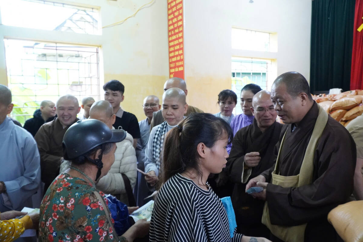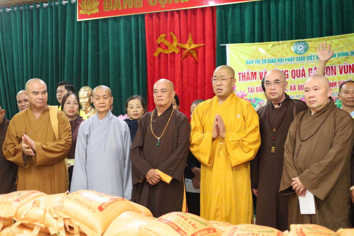Thượng tọa Thích Quảng Lộc đại diện đoàn phát biểu tại Thôn 3: “Đồng Tháp tuy xa nhưng lòng người Phật tử không xa. Hôm nay, đoàn mang chút quà nhỏ đến gửi tặng, mong san sẻ phần nào những khó khăn của bà con nơi đây. Mưa bão rồi sẽ qua, nhưng tình người và ánh sáng từ bi thì luôn còn mãi. Cầu chúc quý vị sớm ổn định cuộc sống, an cư lạc nghiệp.”
