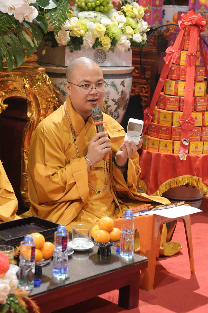 Trước sự chứng minh của Tam Bảo, chư Tôn đức và sự chứng kiến của đại diện hai bên gia đình, đôi tân lang, tân nương đã trao nhẫn cưới cho nhau và dâng lời phát nguyện luôn yêu thương nhau, luôn tôn trọng nhau, luôn bảo vệ cho hạnh phúc của gia đình được trường tồn mãi mãi, nguyện sẽ hành trì theo đúng những điều Đức Phật đã chỉ dạy trong kinh Thiện Sinh, đồng thời sẽ cố gắng thực hành, giữ gìn 5 giới của người Phật tử tại gia, nguyện siêng năng, tinh tấn tu học để trở thành những người phật tử chân chính, hộ trì Tam Bảo.