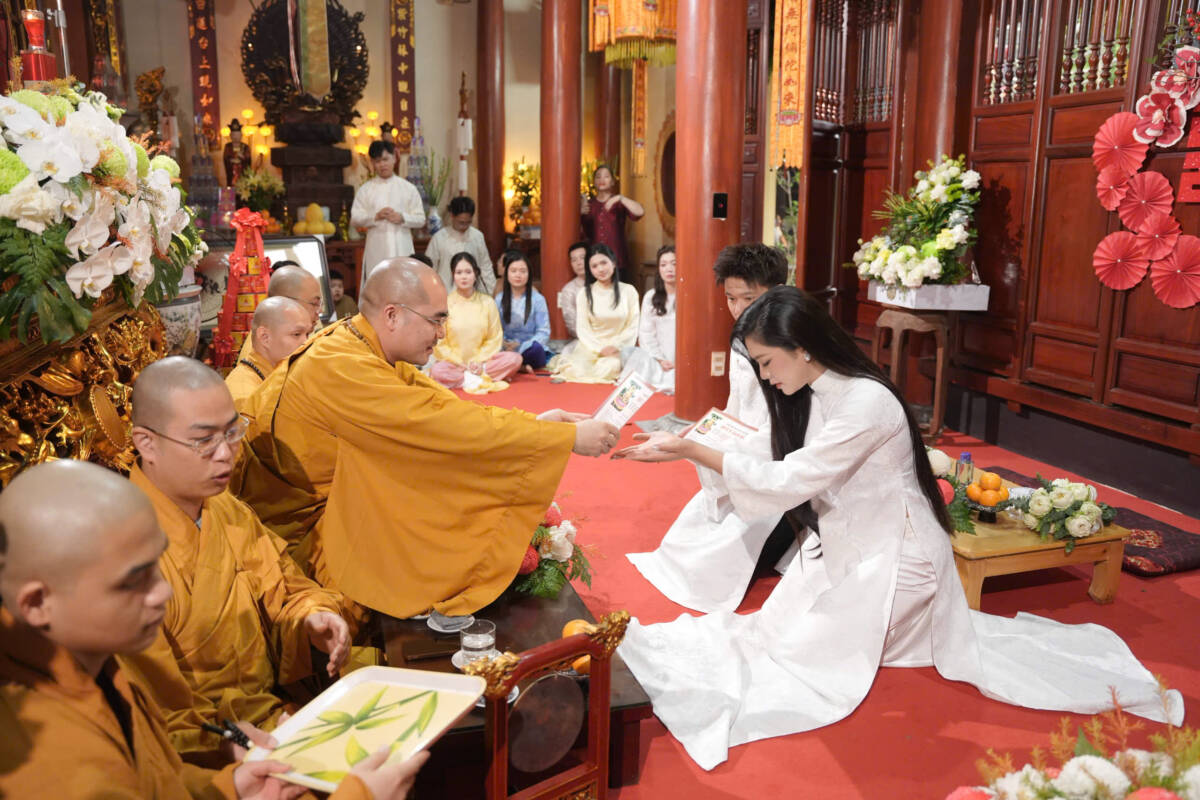 Trước khi cử hành nghi lễ hằng thuận, đôi bạn trẻ đã được chư Tăng tác pháp quy y Tam Bảo và trao truyền Ngũ Giới để làm kim chỉ nam cho cuộc sống hiện tại. Tại buổi lễ, ĐĐ. Thích Giác Hợp đã truyền trao Tam Quy, Ngũ giới và có thời pháp thoại ngắn chia sẻ đến với đôi tân lang tân nương , giúp hai bạn nhận thức rõ hơn về việc Quy y Tam Bảo từ đó sống theo lời Phật dạy, giữ gìn 5 giới của người Phật tử tại gia, xây dựng gia đình trên nền tảng đạo đức của người con Phật.