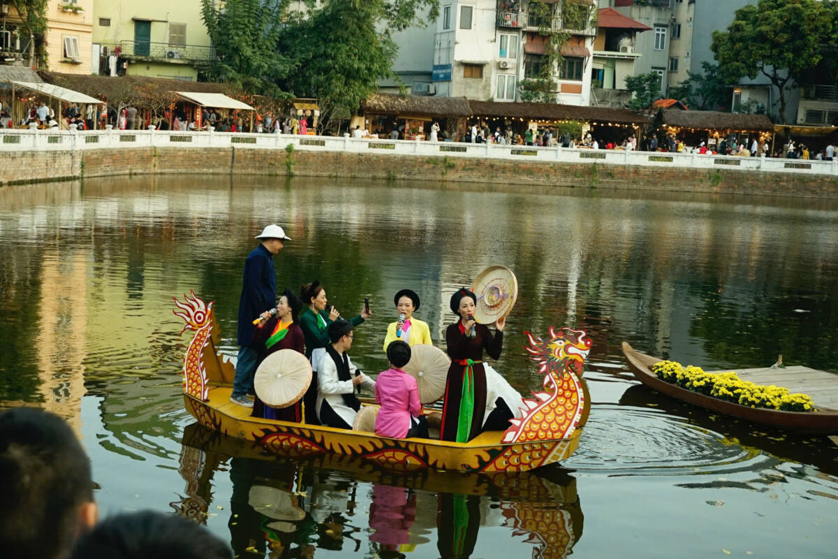 Tiếp nối mạch nguồn văn hóa ấy, không gian Hồ Văn năm nay hiện lên đầy độc đáo với những nếp tre nứa mộc mạc mà tinh tế, tạo nên một “làng sĩ tử” thu nhỏ vừa gần gũi vừa đậm chất nghệ thuật. Ngay dưới mặt hồ xanh trong, tiếng hát Quan họ “vang, rền, nền, nảy” dìu dặt trên mạn thuyền rồng đã thực sự đánh thức mọi giác quan, giúp mỗi người thêm thấu hiểu và yêu quý những di sản vô giá của cha ông.