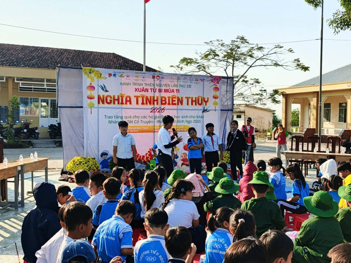 PGĐS – Sáng ngày 01/02/2026 (nhằm ngày 14 tháng Chạp năm Ất Tỵ), Câu lạc bộ Thiện nguyện Cỏ Bốn Lá (thành viên Mạng lưới Tình nguyện Quốc gia khu vực miền Nam thuộc Trung tâm Tình nguyện Quốc gia – TW Đoàn TNCS HCM) phối hợp UB MTTQ Việt Nam xã Bình Thành, Đoàn TNCS HCM xã Bình Thành và BCH Hội Chữ Thập Đỏ xã Bình Thành (tỉnh Tây Ninh) tổ chức chuỗi hoạt động xuân từ bi mùa 11, với chủ đề “Nghĩa Tình Biên Thùy” 2026 tại xã biên giới Bình Thành, tỉnh Tây Ninh.