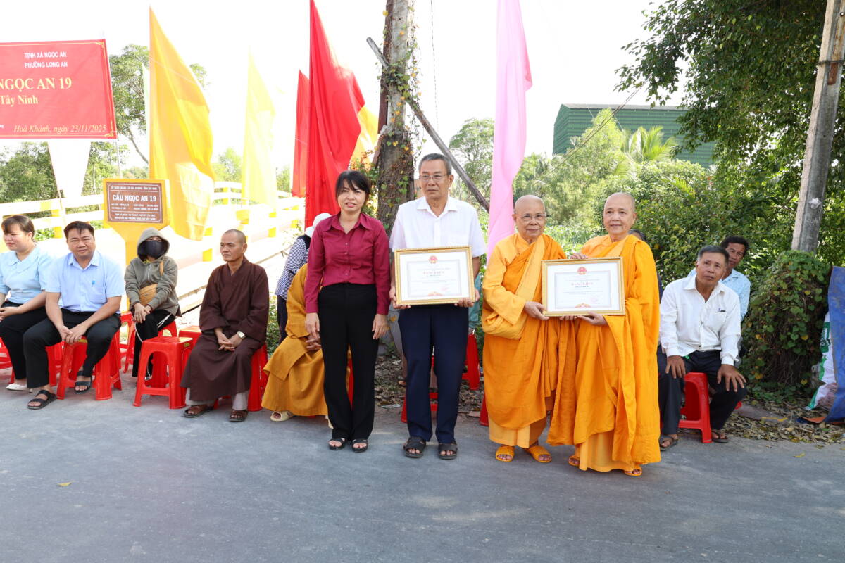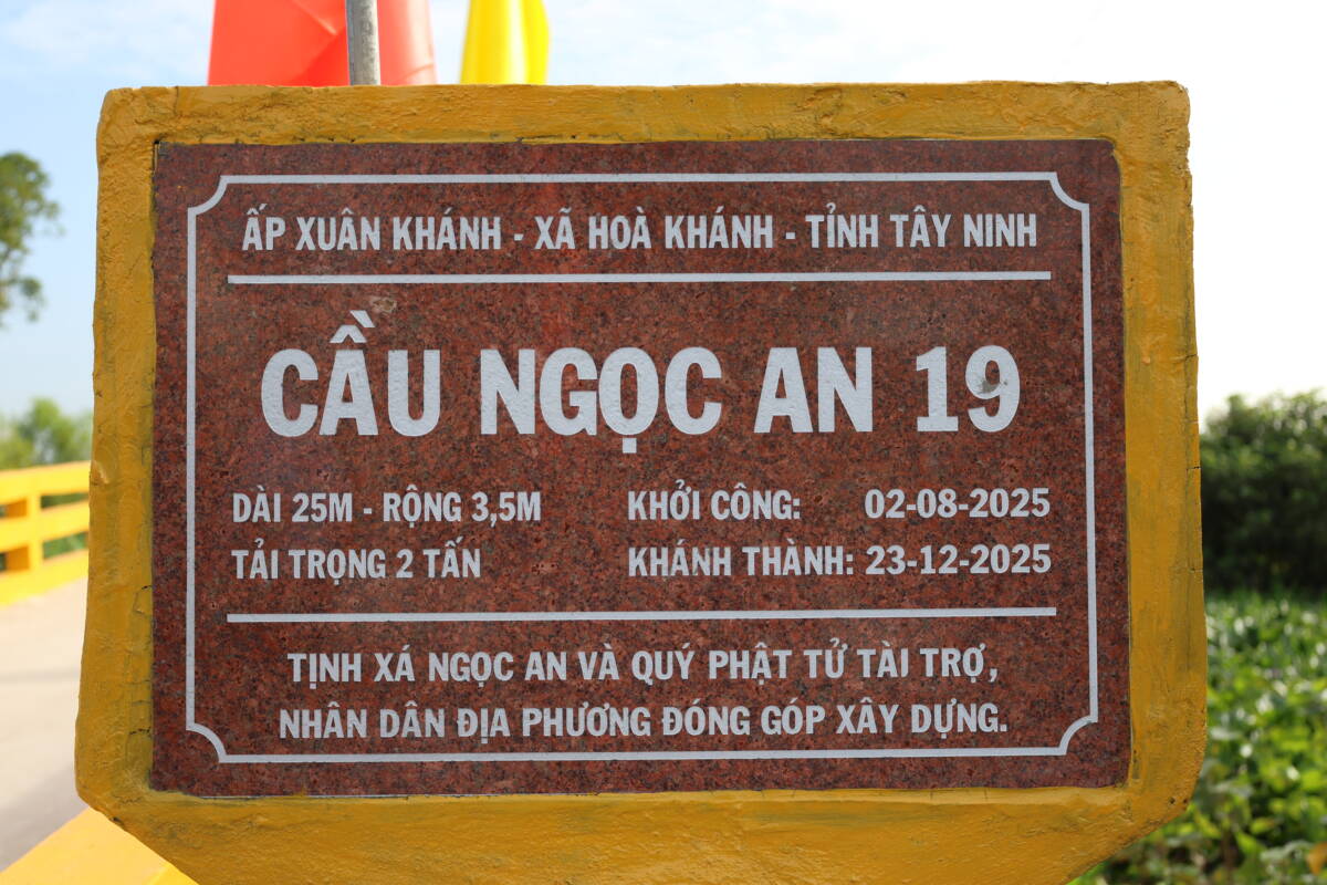 Sau thời gian thi công từ ngày A02/8/2025, cầu Ngọc An 19 đã hoàn thành viên mãn trong niềm hoan hỷ của người dân địa phương. Công trình được xây dựng bằng bê-tông cốt thép, dài 25m, rộng 3,5m, tải trọng 2 tấn, với tổng kinh phí 280 triệu đồng. Trong đó, Tịnh xá Ngọc An (phường Long An) cùng quý Phật tử phát tâm ủng hộ 180 triệu đồng, phần còn lại do nhân dân địa phương đóng góp đối ứng.