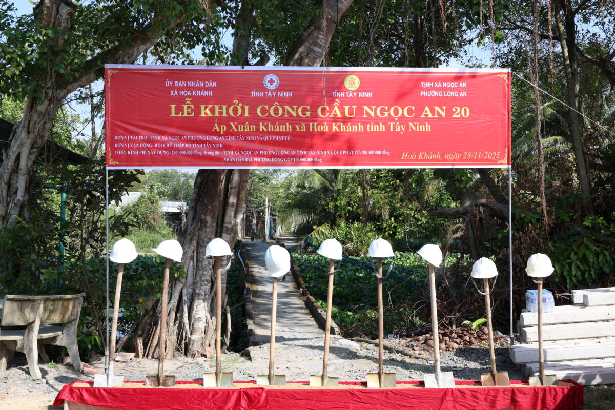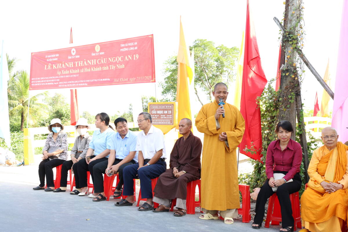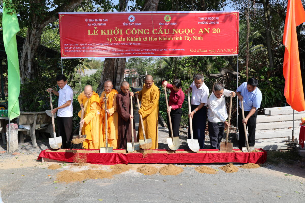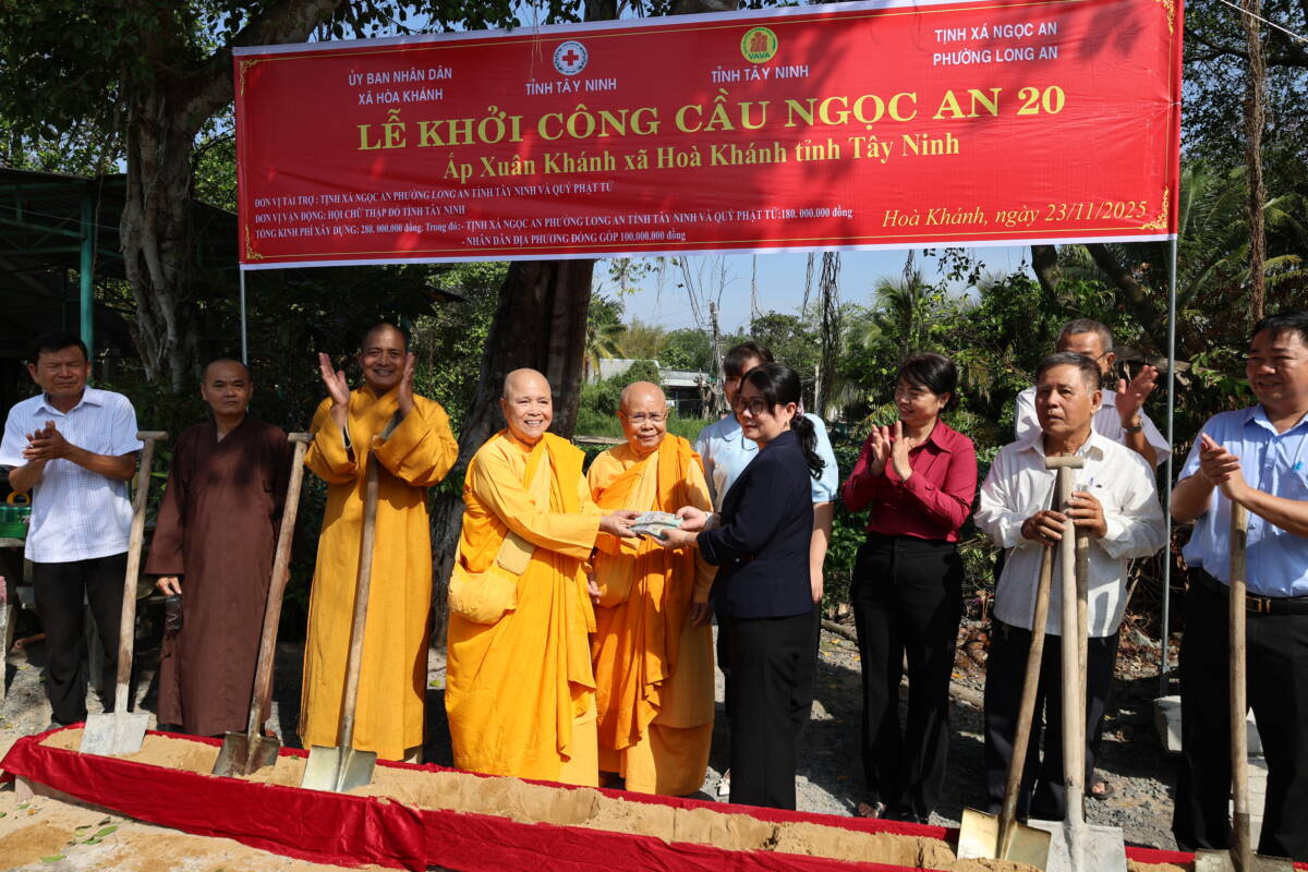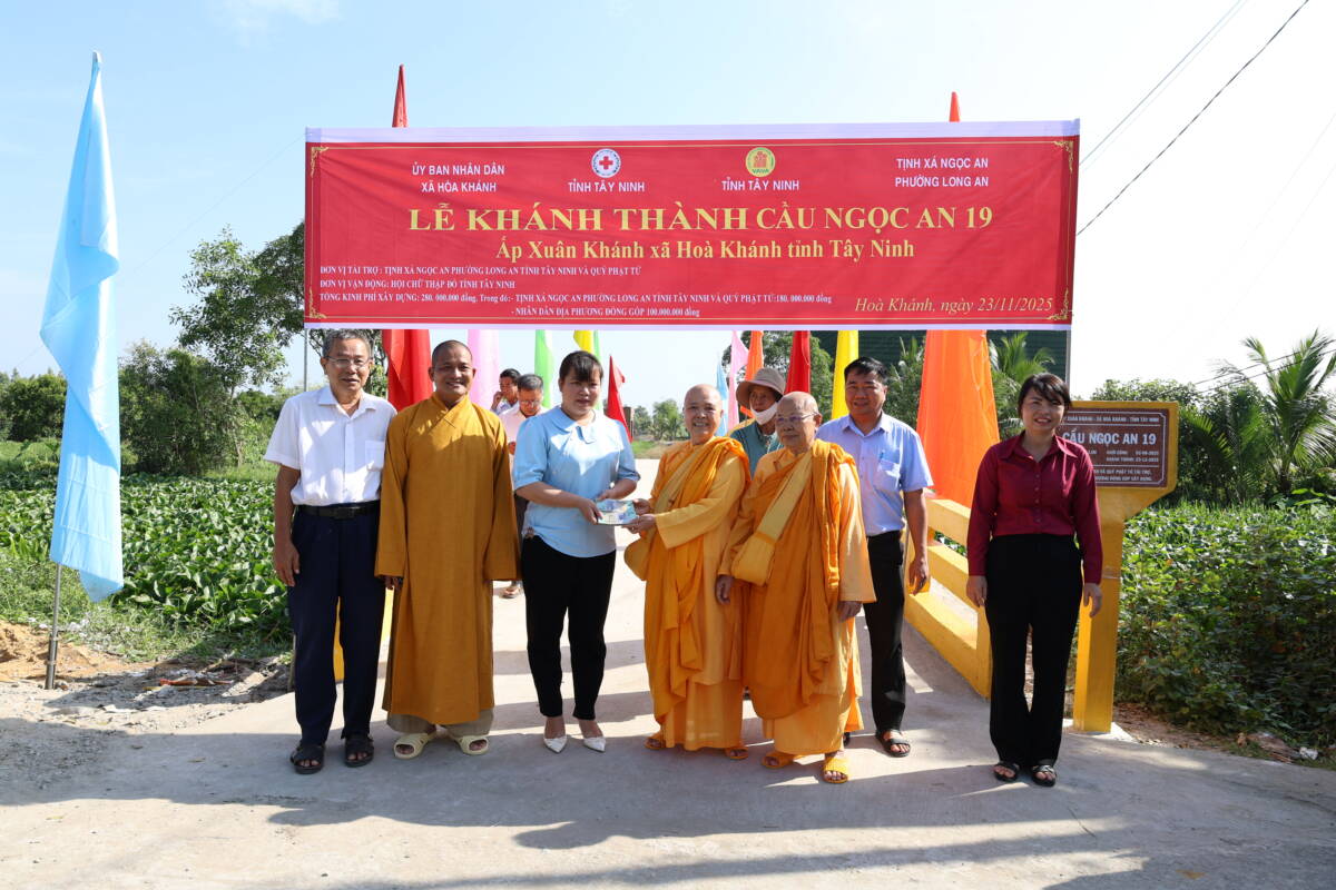 PGĐS – Trong tinh thần từ bi phụng sự và đồng hành cùng cộng đồng, ngày 23/12/2025, tại ấp Xuân Khánh, xã Hòa Khánh, tỉnh Tây Ninh, Ban Trị sự GHPGVN tỉnh phối hợp cùng chính quyền địa phương và Tịnh xá Ngọc An đã trang nghiêm tổ chức lễ khánh thành cầu giao thông nông thôn Ngọc An 19, đồng thời cử hành lễ động thổ khởi công xây dựng cầu Ngọc An 20.