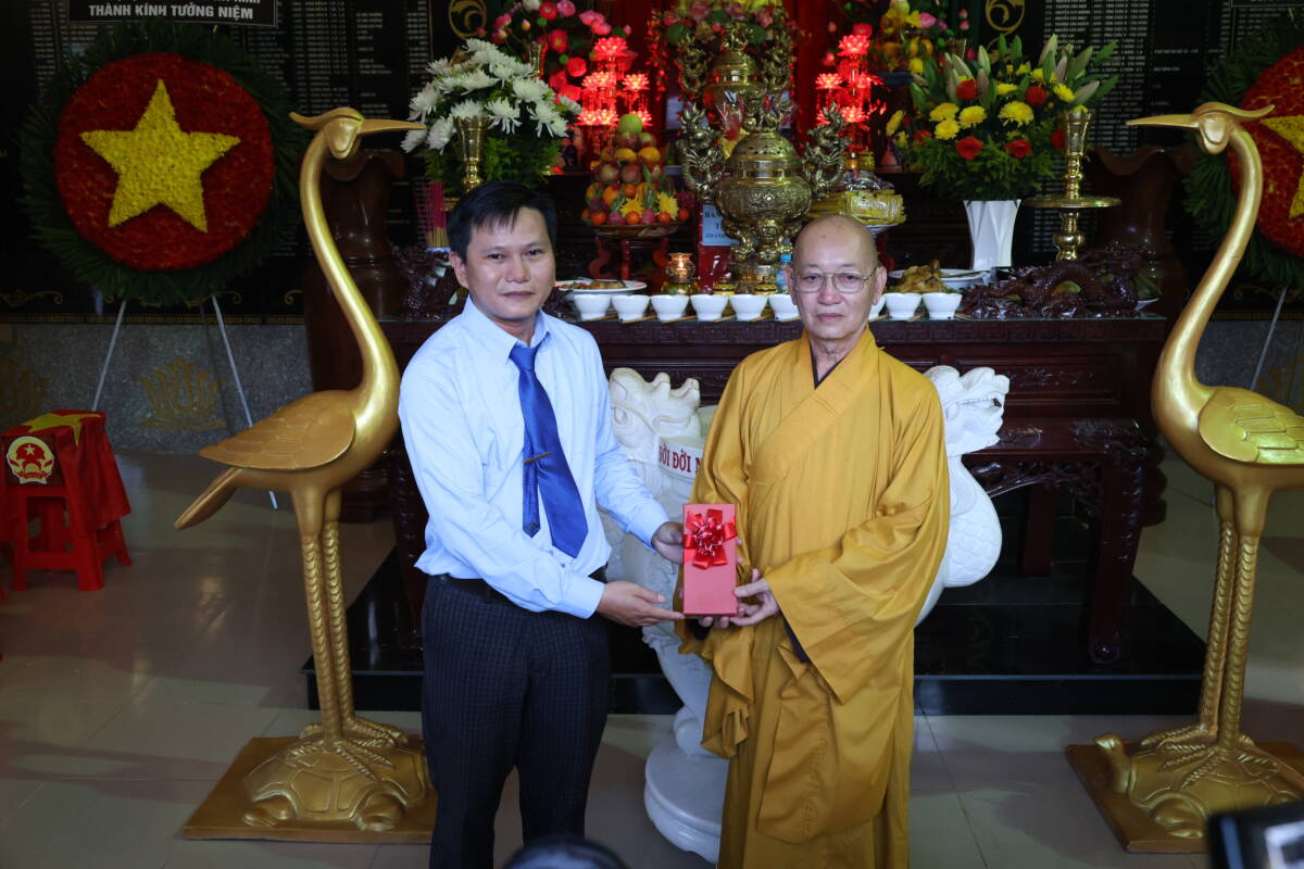 Trong không gian linh thiêng của Nhà tưởng niệm, chư Tôn đức và đại biểu đã dâng hương, dành phút mặc niệm tưởng nhớ hơn 3.200 anh hùng liệt sĩ đang yên nghỉ tại đây. Dịp này, Ban Tổ chức đã trao tặng nhiều phần quà ý nghĩa đến các gia đình chính sách, hộ khó khăn trên địa bàn xã Vĩnh Hưng.