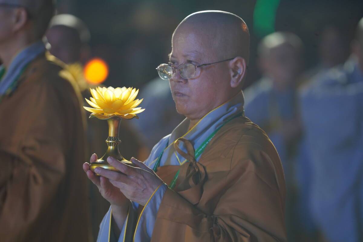 Khi toàn thể hội chúng tâm đã tịnh niệm đã an, Sư cô Như Tâm, điều phối chương trình đã cung thỉnh đại chúng cùng nâng ngọn đèn, lắng tâm thành kính hướng về xứ Ấn Độ, ôn lại lịch sử đức Từ phụ Thích Ca Mâu Ni, gợi nhắc lại hành trình xuất gia tầm đạo của đức Thánh Tổ Ni Đại Ái Đạo Kiều Đàm Di và đảnh lễ cung kinh chư Tôn đức Ni tiền bối hữu công Phật giáo Việt Nam qua các thời kỳ. Đồng thời dâng lời đảnh lễ bái tạ tri ân của chư Phật chư Tổ, công ơn của tiền nhân và dâng lời phát nguyện: Dẫu không vang danh, không vĩ đại như Đức Thánh Tổ, dẫu không lỗi lạc như các vị Trưởng lão Ni tiền bối nhưng cũng xin cho chúng con đủ nghị lực đủ sáng suốt đủ nhu nhuyến trong hạnh nguyện tứ vô lượng tâm…
