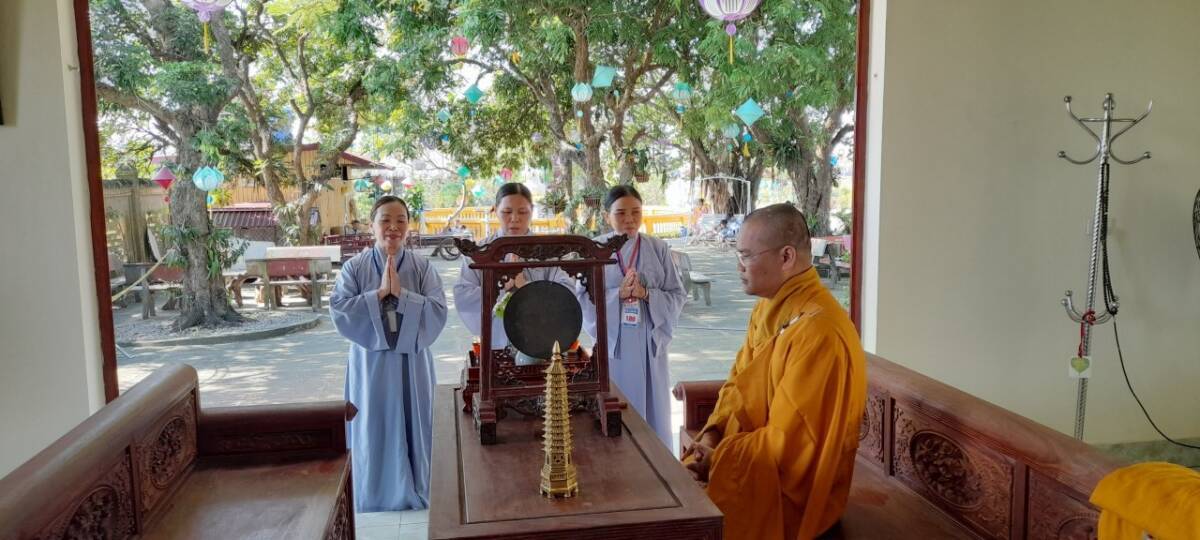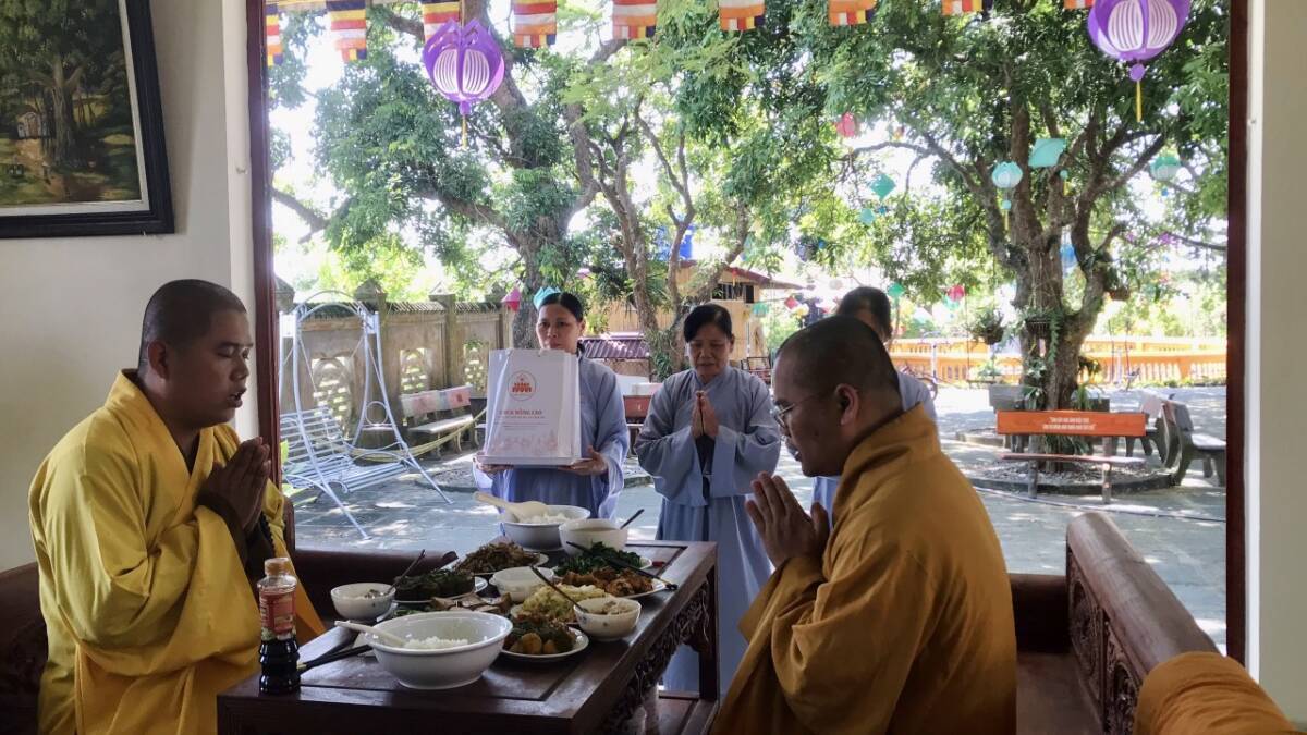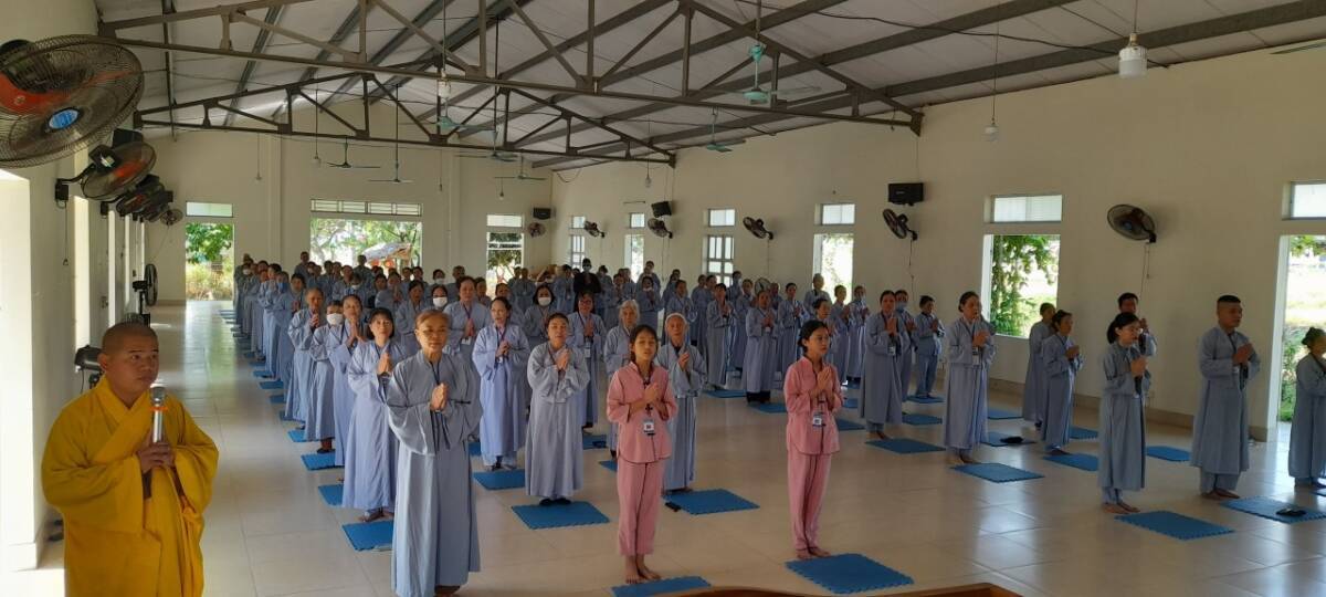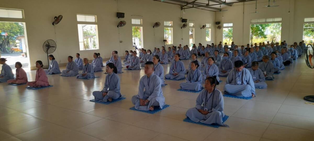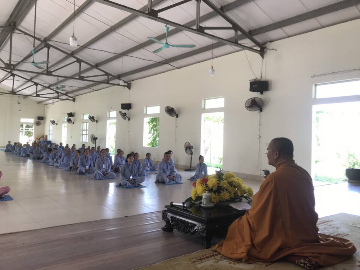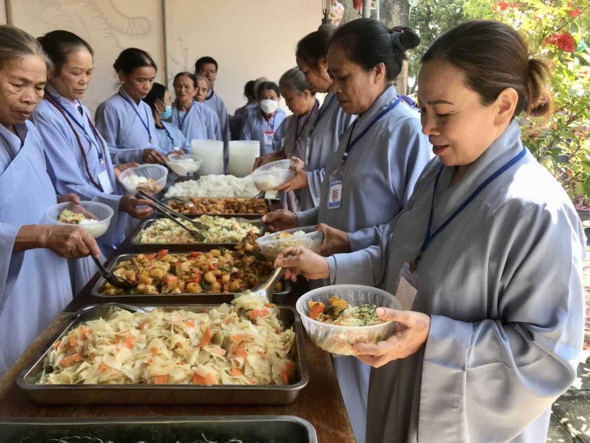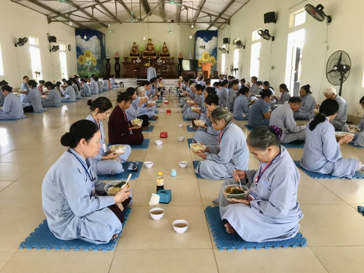 Buổi nói chuyện kết thúc trong niềm hỷ lạc của mọi người, đại chúng dùng cơm dưới sự hướng dẫn của Phật tử Liên Hà. Đặc biệt, trong khoá tu này, trước khi dùng cơm trưa trong chánh niệm tại nhà Tổ, đại chúng đã được gieo duyên cúng dường Trai tăng lên chư Tôn đức hiện tiền do Phật tử Liên Hồng hướng dẫn.