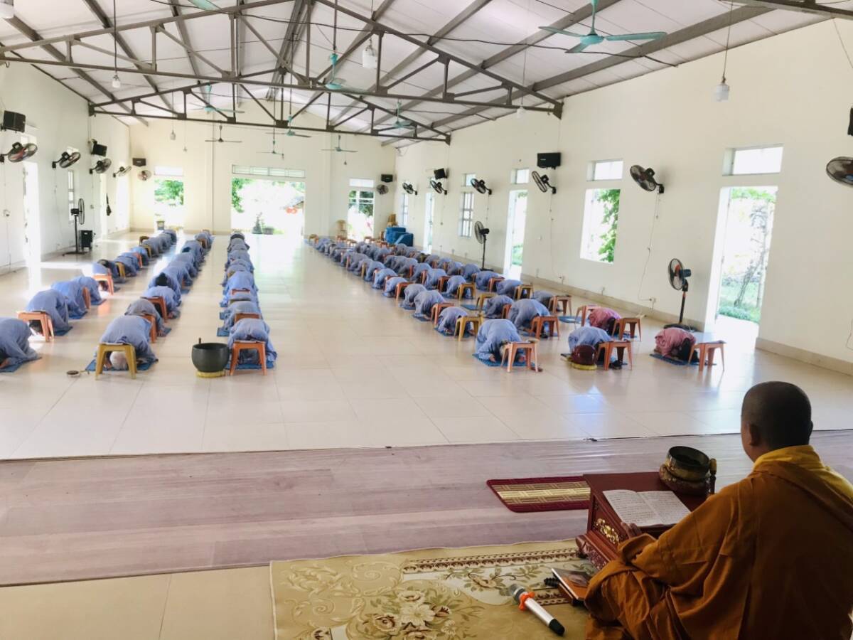 Buổi nói chuyện kết thúc trong niềm hỷ lạc của mọi người, đại chúng dùng cơm dưới sự hướng dẫn của Phật tử Liên Hà. Đặc biệt, trong khoá tu này, trước khi dùng cơm trưa trong chánh niệm tại nhà Tổ, đại chúng đã được gieo duyên cúng dường Trai tăng lên chư Tôn đức hiện tiền do Phật tử Liên Hồng hướng dẫn.