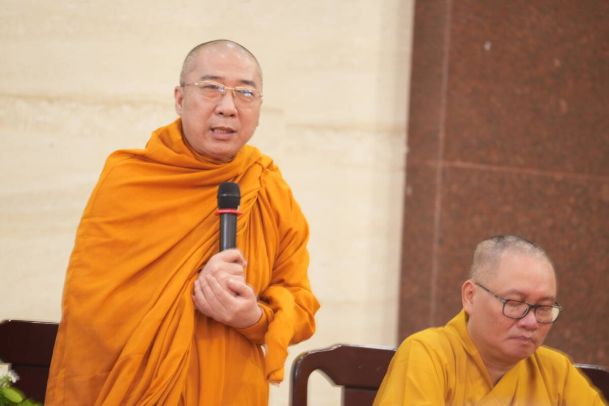 Ảnh :TT Thích Minh Quang, UV Thư ký HĐTS, Phó VP TƯ GHPGVN, Phó trưởng Ban Thường trực Ban Nghi lễ TƯ phát biểu cuộc họp thảo luận
