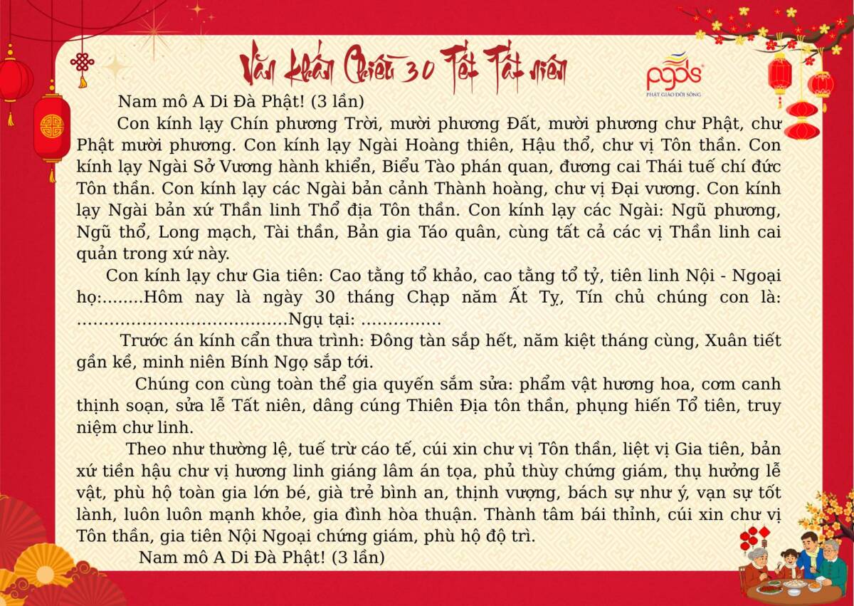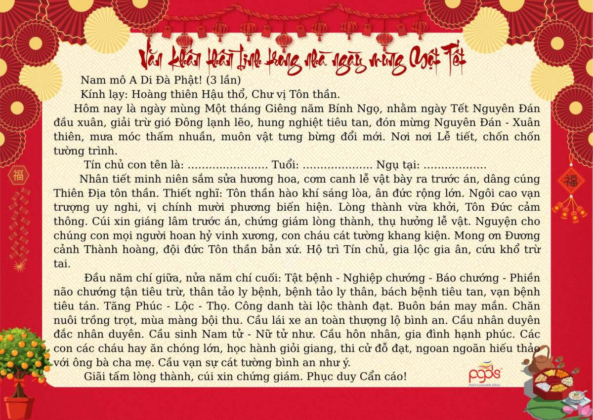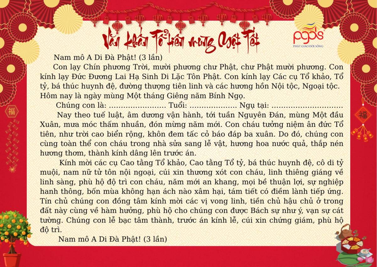 PGĐS – Trong không khí Xuân mới 2026 đang về, việc thực hành các nghi lễ khấn nguyện cổ truyền ngày Tết không chỉ là nếp sinh hoạt tâm linh của người Việt, mà còn là dịp để mỗi người lắng lòng, hướng về tổ tiên, Tam bảo và cội nguồn đạo lý. Dưới đây là một số bài văn khấn cổ truyền dùng trong những ngày Tết Nguyên đán, được sưu tầm và tổng hợp nhằm giúp quý vị thuận tiện tham khảo, thực hành với tâm thành kính, nguyện cầu một năm mới bình an, gia đạo hòa hợp, phước lành tăng trưởng.