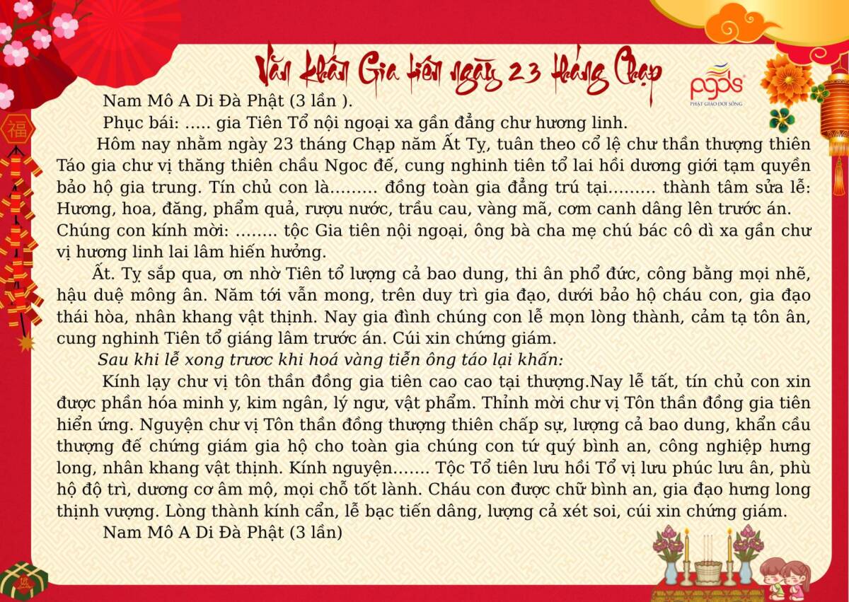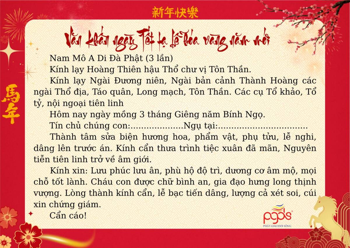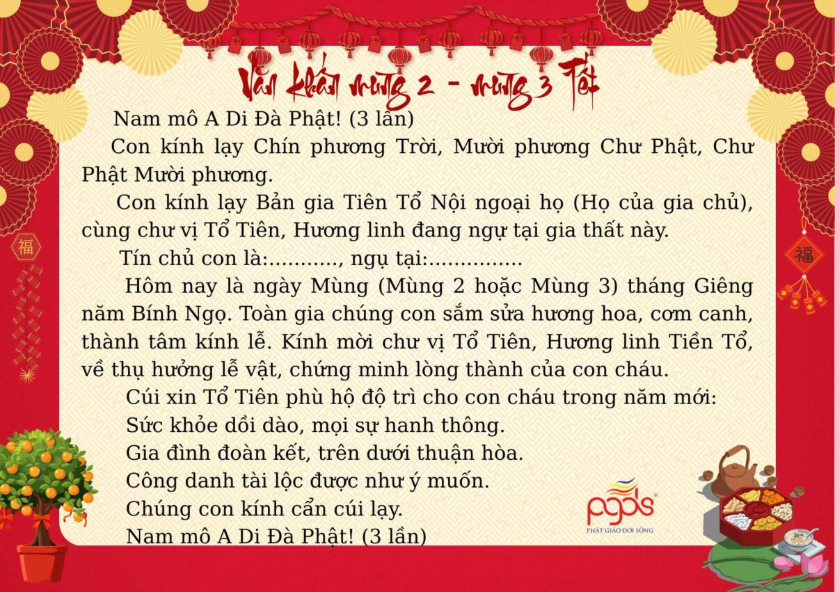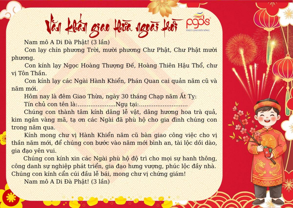 PGĐS – Trong không khí Xuân mới 2026 đang về, việc thực hành các nghi lễ khấn nguyện cổ truyền ngày Tết không chỉ là nếp sinh hoạt tâm linh của người Việt, mà còn là dịp để mỗi người lắng lòng, hướng về tổ tiên, Tam bảo và cội nguồn đạo lý. Dưới đây là một số bài văn khấn cổ truyền dùng trong những ngày Tết Nguyên đán, được sưu tầm và tổng hợp nhằm giúp quý vị thuận tiện tham khảo, thực hành với tâm thành kính, nguyện cầu một năm mới bình an, gia đạo hòa hợp, phước lành tăng trưởng.