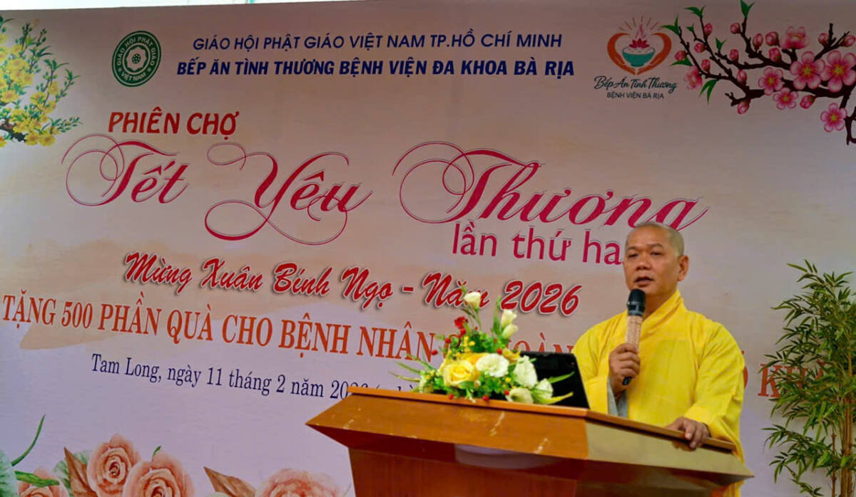 Phát biểu khai mạc phiên chợ, Thượng tọa Thích Thiện Thuận đã ân cần thăm hỏi Ban Giám đốc bệnh viện, đội ngũ y, bác sĩ và toàn thể bệnh nhân đang điều trị; bày tỏ niềm vui hoan hỷ đây là dịp để bếp ăn góp phần lan tỏa từ bi yêu thương của nhà Phật đến các bệnh nhân và thân nhân, kết nối những tấm lòng biết sống vì nhau. Qua đây, thượng tọa mong rằng mỗi phần quà là sự động viên tinh thần giúp các các bệnh nhân sớm mạnh khỏe, tiêu trừ tật bệnh. Cầu chúc mọi người đón một năm mới Bính Ngọ 2026 vạn sự kiết tường và nhiều niềm vui.