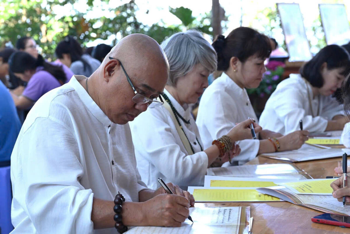 Đầu tiên các em tham gia đảnh lễ 12 hạnh nguyện Quán Âm. Theo đó, các em cắm hoa tươi tặng mẹ, tạo hình đất sét yêu thương tặng ba và tô tranh Bồ-tát Quán Âm hướng nguyện công đức cầu an đến ba mẹ.