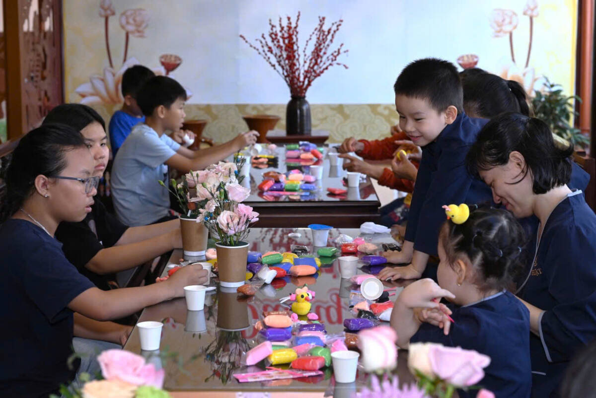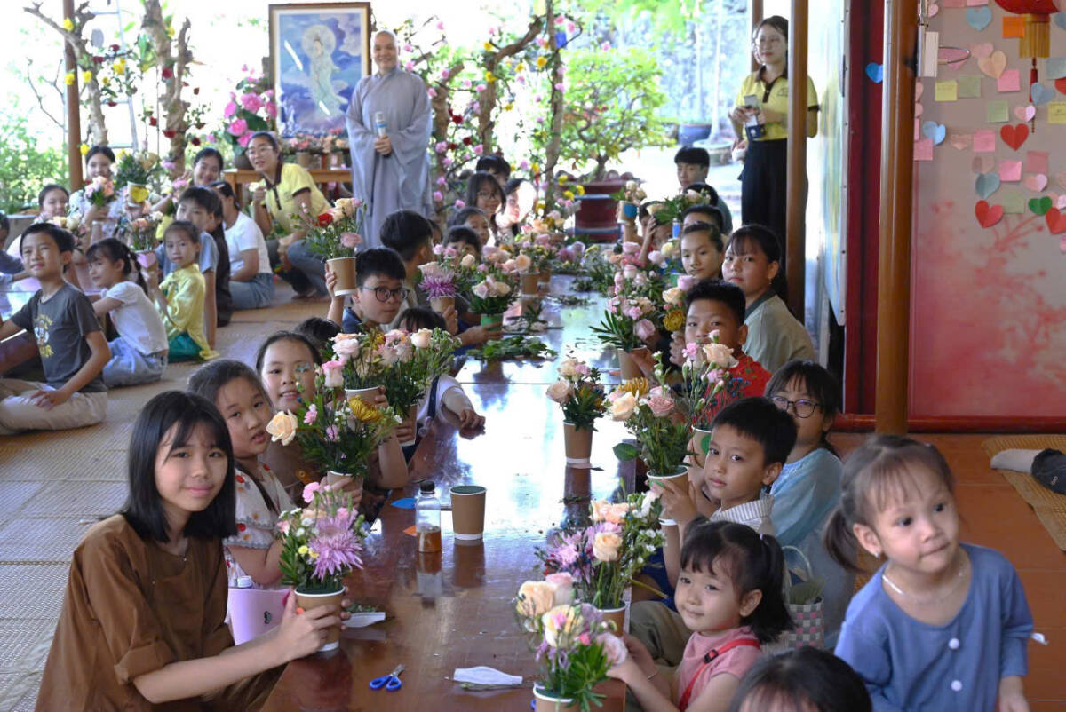 Đầu tiên các em tham gia đảnh lễ 12 hạnh nguyện Quán Âm. Theo đó, các em cắm hoa tươi tặng mẹ, tạo hình đất sét yêu thương tặng ba và tô tranh Bồ-tát Quán Âm hướng nguyện công đức cầu an đến ba mẹ.