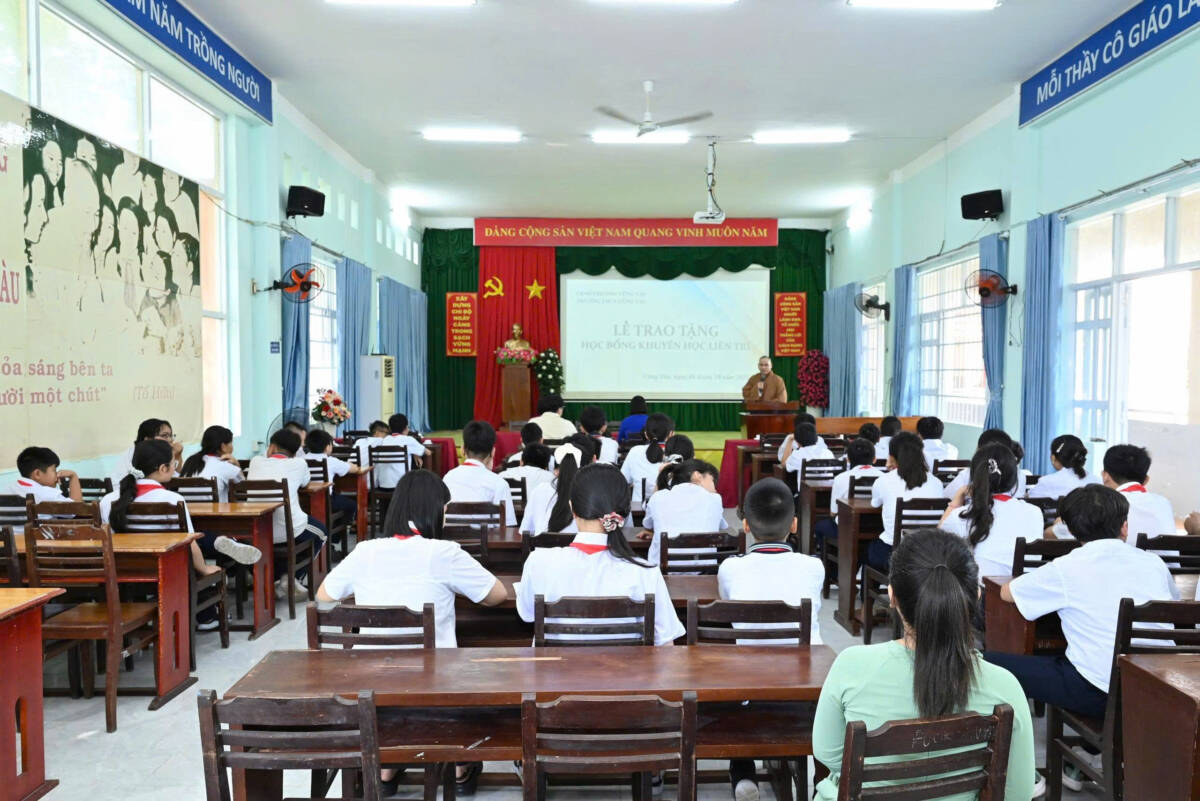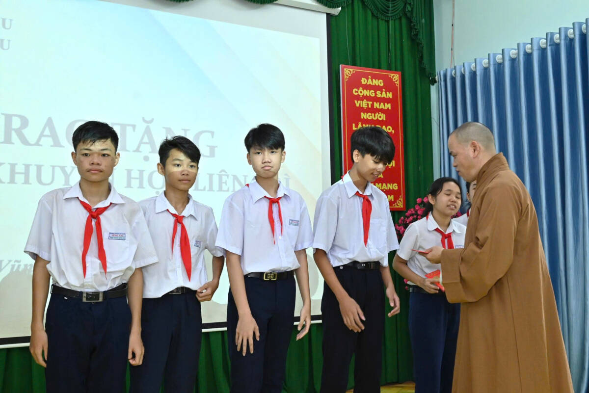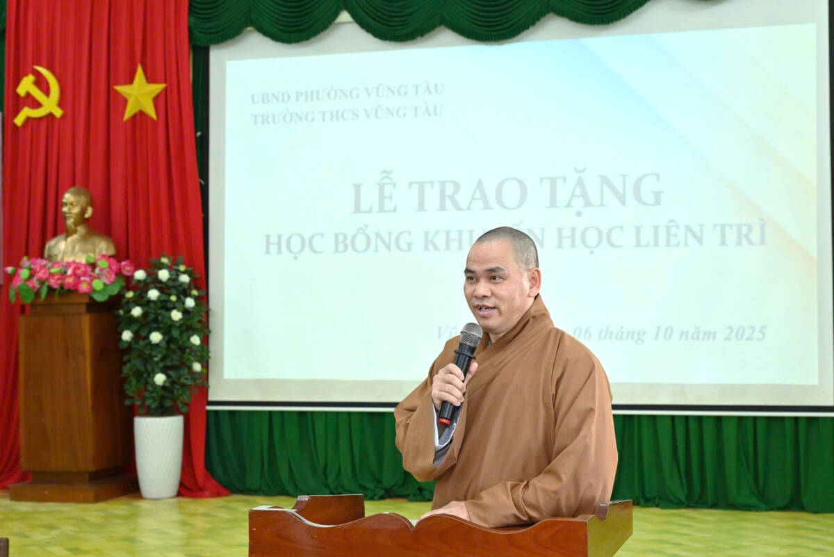 Thượng tọa Thích Thiện Thông, đại diện Quỹ Học bổng Khuyến học chùa Liên Trì đã có lời chia sẻ đầy cảm động, khuyến khích các em tiếp tục nỗ lực vượt khó, học tập tốt để trở thành người hữu ích cho xã hội. Thượng tọa nhấn mạnh: “Mỗi suất học bổng không chỉ là sự hỗ trợ vật chất, mà còn là niềm tin yêu mà cộng đồng Phật tử gửi gắm đến các em.”