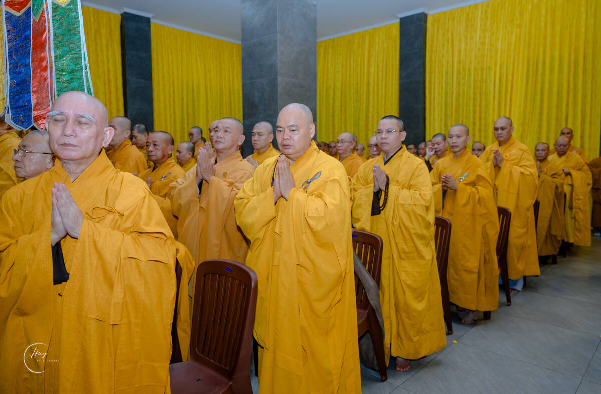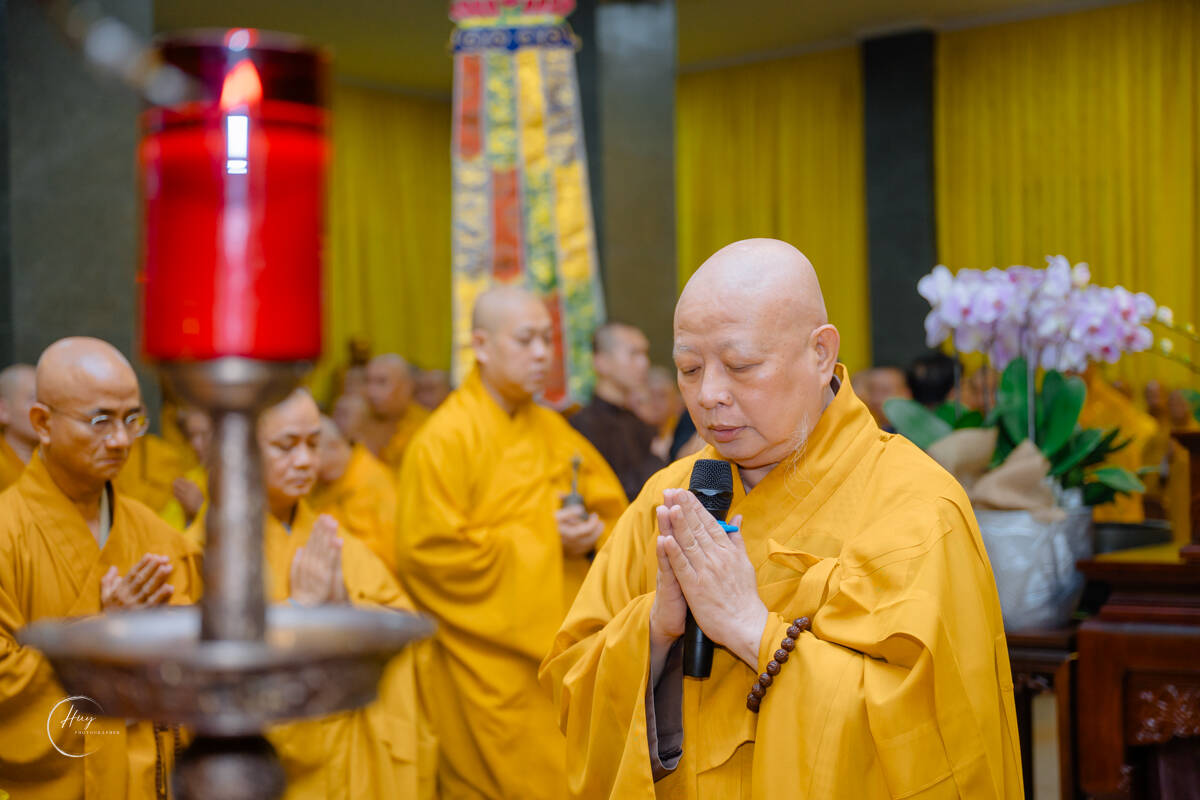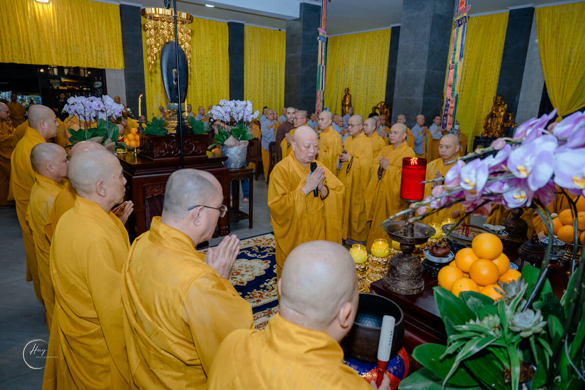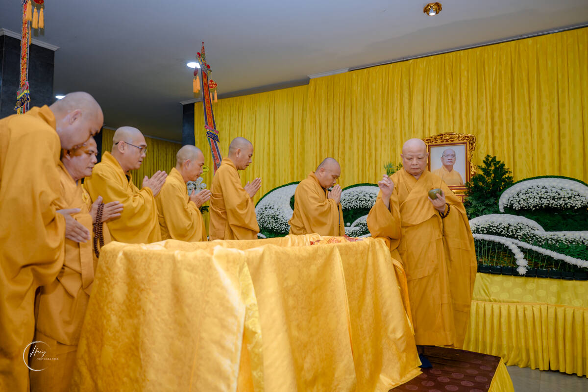Tại Giác linh đường, chư Tôn đức Trưởng lão dâng hương bạch Phật, cầu nguyện Giác linh Hòa thượng cao đăng Phật quốc. Hòa thượng Thích Lệ Trang – Phó Chủ tịch Hội đồng Trị sự, Trưởng ban Nghi lễ Trung ương, Trưởng ban Trị sự GHPGVN TP.HCM xướng lễ cầu nguyện, chủ trì nghi thức sái tịnh Giác linh đường và kim quan.