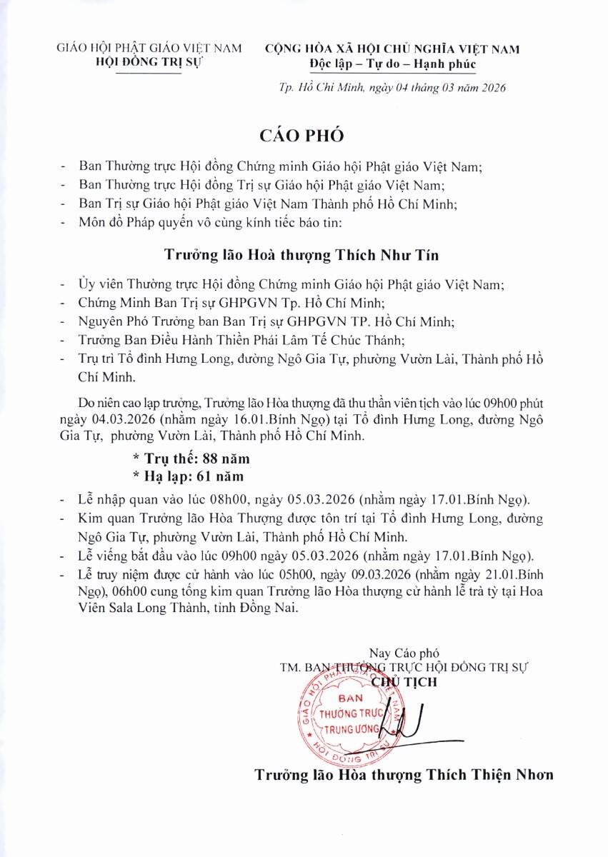 PGĐS – Trưa ngày 04/3/2026, Trưởng lão Hòa thượng Thích Thiện Nhơn, Phó Pháp chủ Hội đồng Chứng minh, Chủ tịch Hội đồng Trị sự GHPGVN, thay mặt Ban Thường trực Hội đồng Trị sự GHPGVN, Ban Trị sự GHPGVN TP.HCM và môn đồ pháp quyến, đã trang nghiêm thông báo tin buồn: Trưởng lão Hòa thượng Thích Như Tín đã thu thần viên tịch tại Tổ đình Hưng Long (đường Ngô Gia Tự, phường Vườn Lài, TP.HCM) do niên cao lạp trưởng. Ngài trụ thế 88 năm, hạ lạp 61 năm.