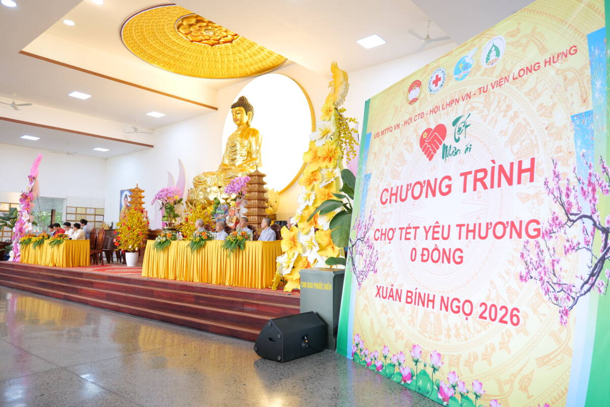 PGĐS – Chiều ngày 08/02/2026 (nhằm 21 tháng Chạp năm Ất Tỵ), trong không khí trang nghiêm và ấm áp trước thềm năm mới, Tu viện Long Hưng đã long trọng tổ chức Lễ tổng kết công tác Phật sự năm 2025, kết hợp tất niên cuối năm và khai mạc phiên “Chợ Tết yêu thương 0 đồng”.