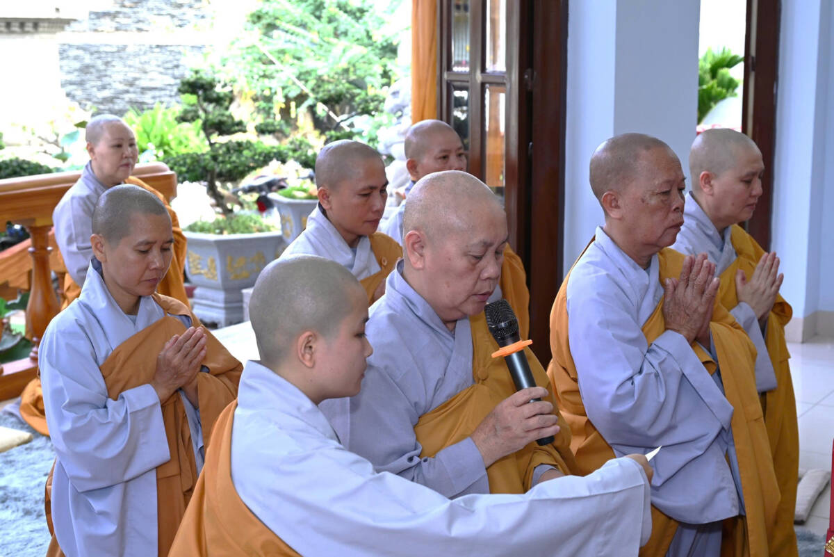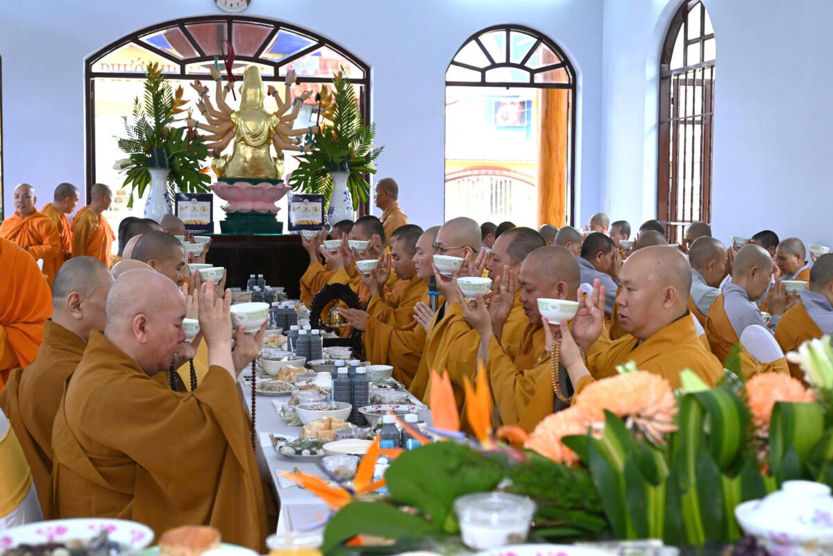 Tại buổi lễ, chư tôn đức Tăng Ni và Phật tử đồng tụng thời kinh Di Đà, thực hiện khóa lễ cúng ngọ theo nghi thức thiền môn.