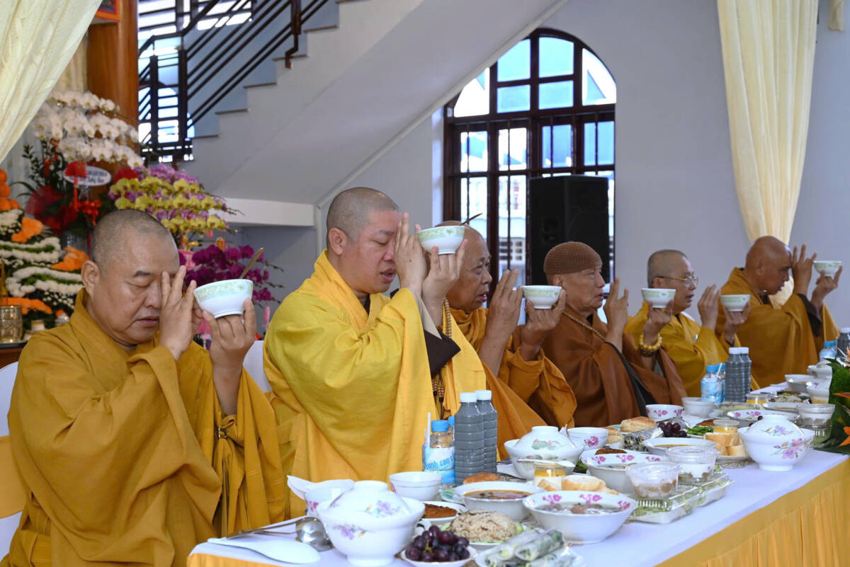 Tại buổi lễ, chư tôn đức Tăng Ni và Phật tử đồng tụng thời kinh Di Đà, thực hiện khóa lễ cúng ngọ theo nghi thức thiền môn.