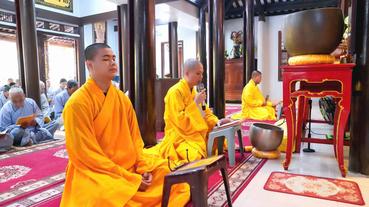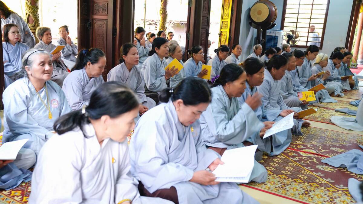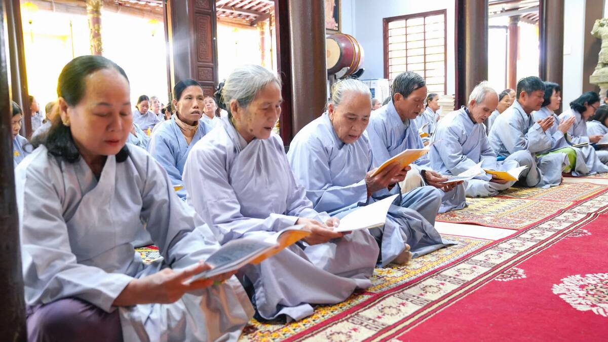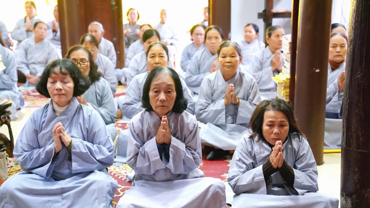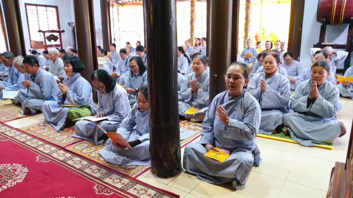 Khóa tu bắt đầu lúc 8 giờ sáng bằng thời tụng kinh A Di Đà, nhất tâm cầu nguyện một năm mới an lành, phước huệ tăng trưởng.