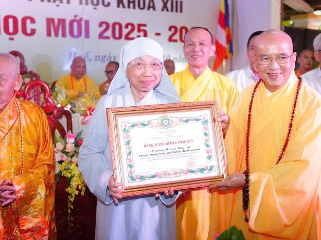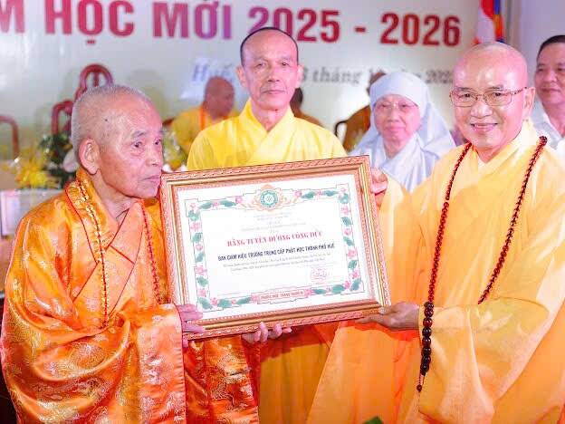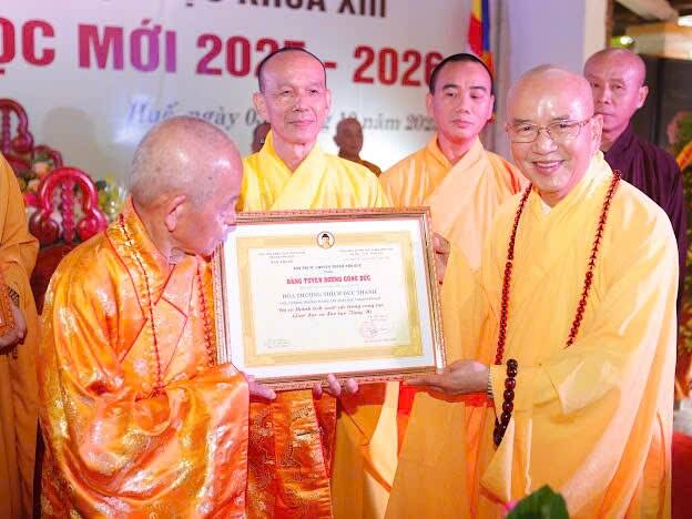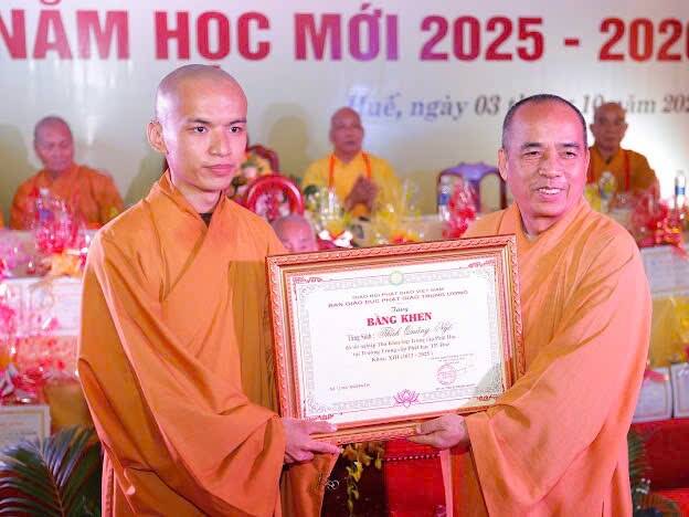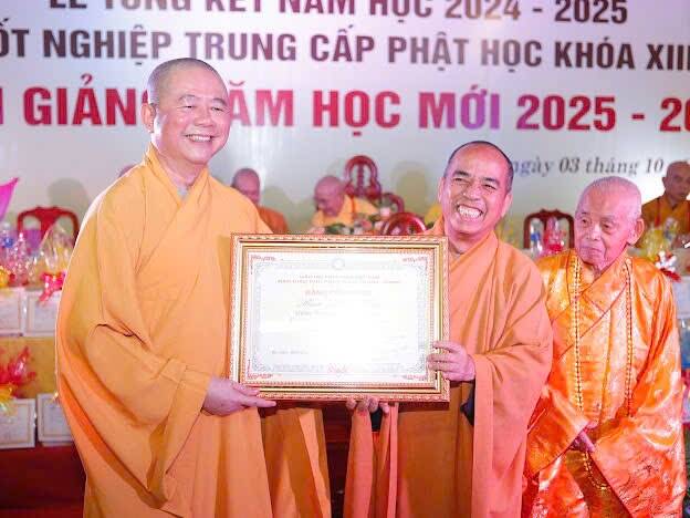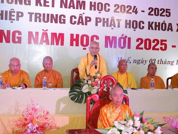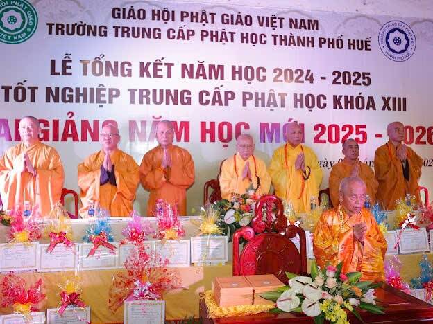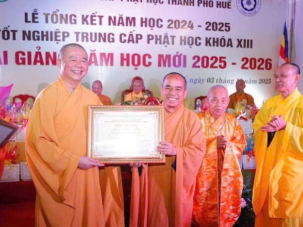 PGĐS – Sáng ngày 03/10/2025 (Nhằm ngày 12/8/Ất Tỵ) tại trường Trung cấp Phật học thành phố Huế (Chùa Báo Quốc, TP Huế), Ban giám hiệu nhà trường đã tổ chức buổi lễ tổng kết năm học 2024 – 2025, cấp phát văn bằng tốt nghiệp Phật học khoá XIII và khai giảng năm học mới 2025 – 2026 các khoá XIV, XV, XVI, lớp Sơ cấp nội điển Phật học và các lớp 10, 11, 12 khối ngoại điển GDTX cấp THPT.