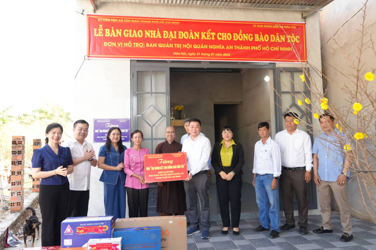 PGĐS – Sáng 31/1/2026, hưởng ứng phong trào “Cả nước chung tay xóa nhà tạm, nhà dột nát” và chung tay công tác “Vì đồng bào dân tộc”, Sở Tôn giáo – Dân tộc Thành phố, phối hợp với Ban Đại diện Phật giáo người Hoa, Ban Quản trị Hội quán Nghĩa An, và Ủy ban nhân dân xã Hoà Hội tổ chức khánh thành và bàn giao 2 căn nhà Đại đoàn kết cho các hộ dân tại ấp 5 và ấp 17, xã Hoà Hội, TPHCM.