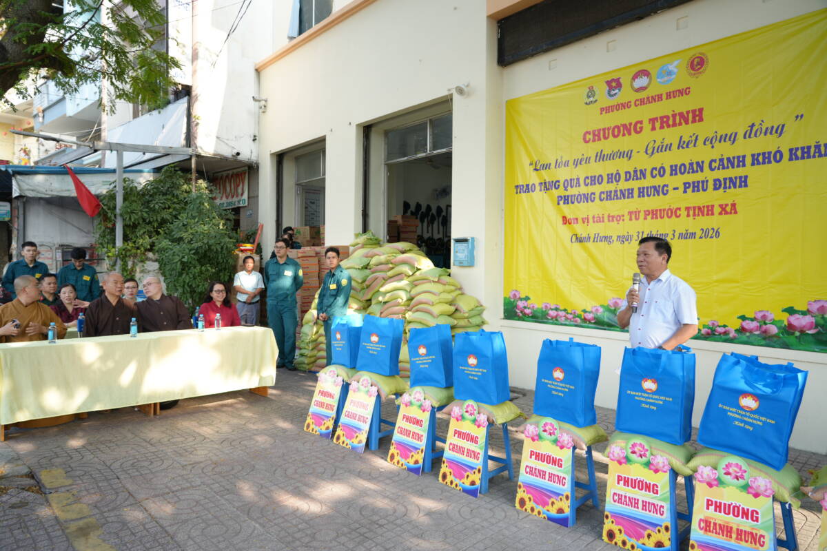 Phát biểu tại buổi trao quà ông Trương Công Hồ – UVBTV Đảng uỷ Chủ tịch UBMTTQVN phường Chánh Hưng bày tỏ lòng tri ân tới chư tôn đức Phật giáo người Hoa, đặc biệt tịnh xá Từ Phước đã luôn đồng hành cùng chính quyền sở tại nhằm quan tâm tới hoạt động An sinh Xã hội địa phương, chăm lo giúp đỡ cho người có hoàn cảnh khó khăn.