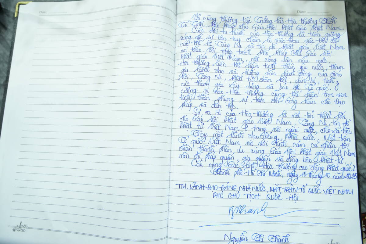 Trong sổ tang, Phó Chủ tịch Quốc hội Nguyễn Thị Thanh viết, vô cùng thương tiếc Trưởng lão Hòa thượng Thích Trí Tịnh. Cuộc đời tu hành của Hòa thượng là tấm gương sáng về sự tận tụy chăm lo việc đạo, việc đời để các thế hệ tăng ni và tín đồ Phật giáo Việt Nam noi theo.