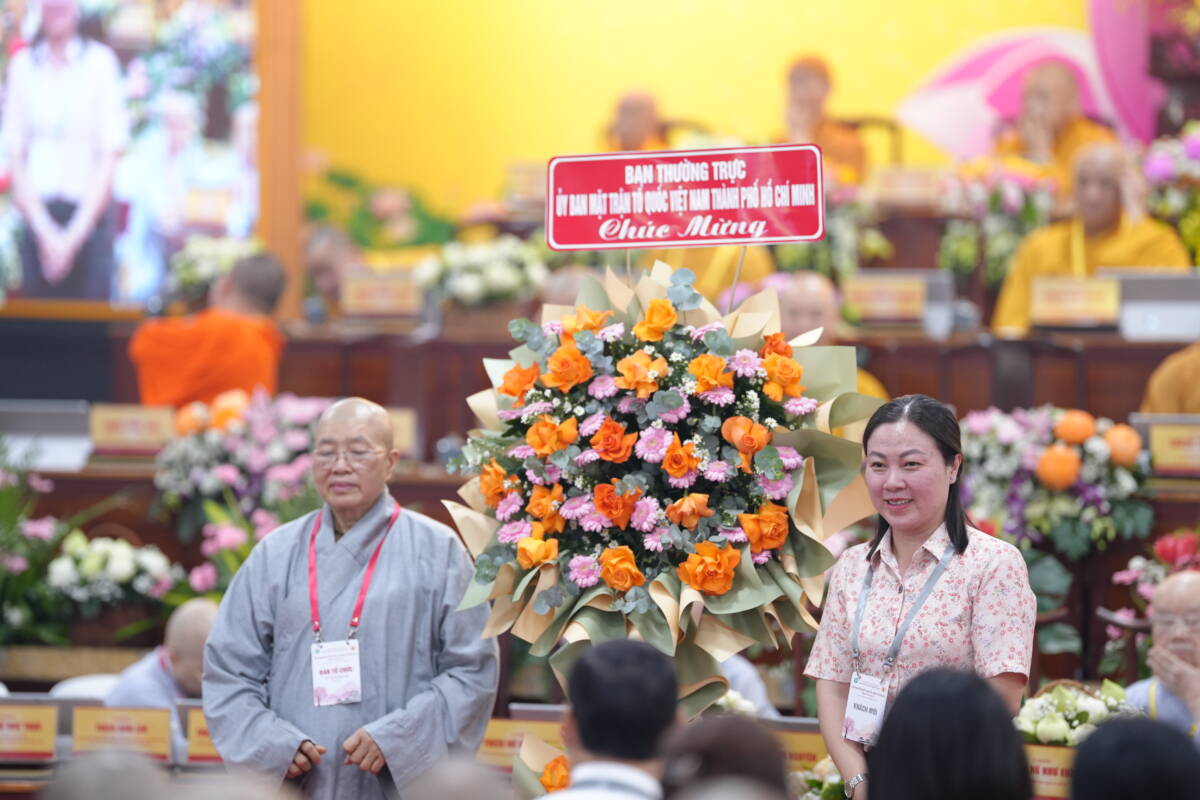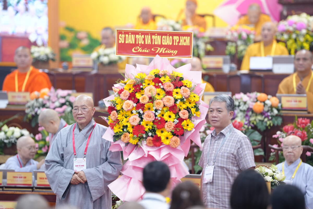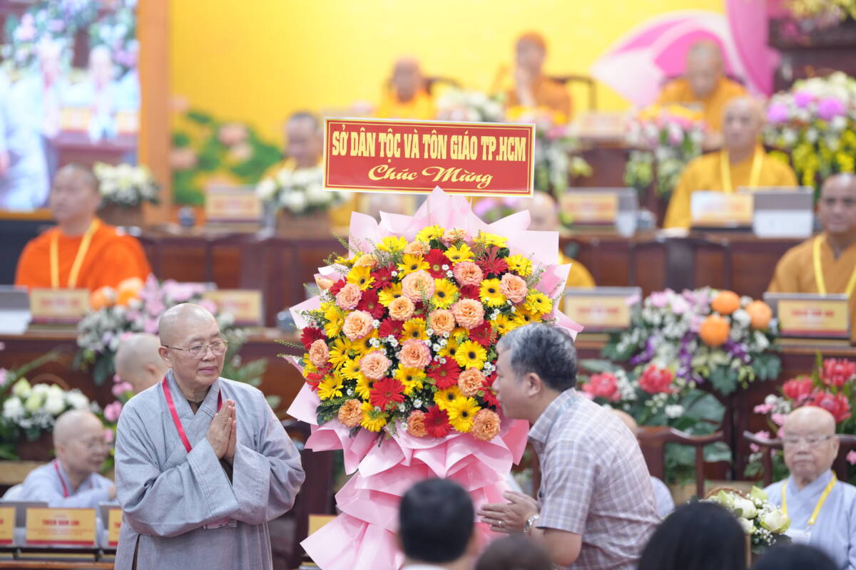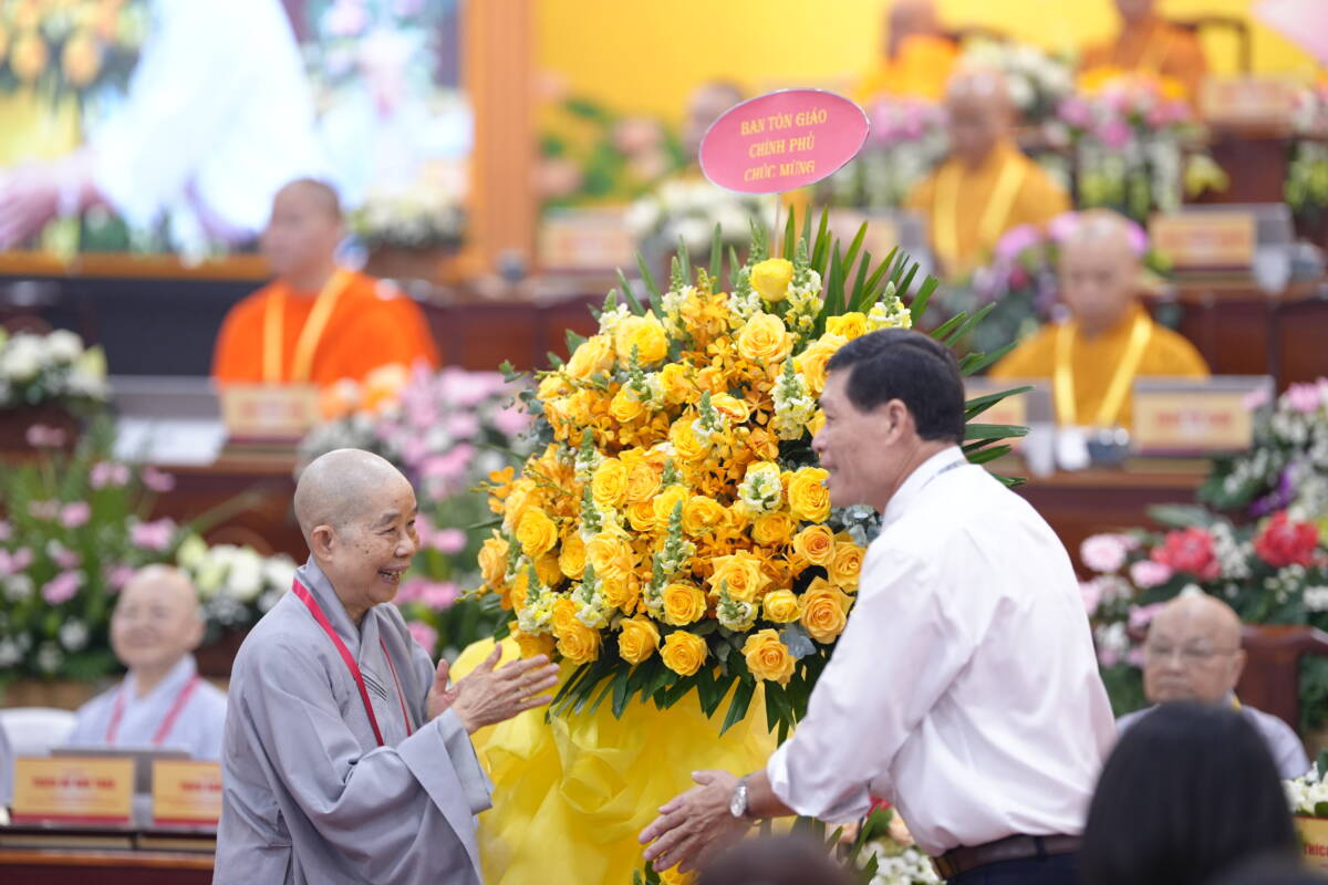 Hội nghị đón nhận nhiều lãng hoa chúc mừng từ các cơ quan quản lý nhà nước cùng lời phát biểu chúc mừng ghi nhận biểu dương của đại diện Ban Tôn giáo chính Phủ.