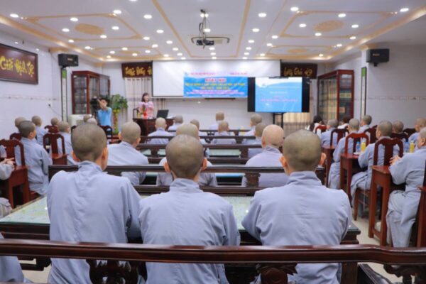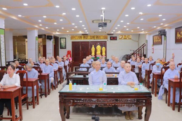Buổi chiều cùng ngày là buổi chia sẻ của bà Trịnh Thị Thanh – Phó chủ tịch Hội Liên hiệp Phụ nữ chia sẻ với chư Ni tại trường Hạ với chủ đề “Một số nội dung Luật tín ngưỡng tôn giáo và hoạt động của Hội Phụ nữ thành phố gắn với các cơ sở tôn giáo”.