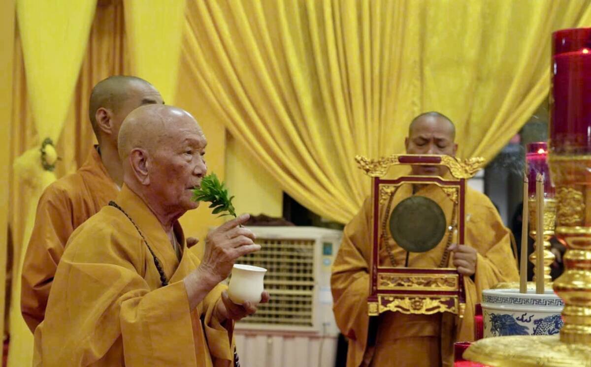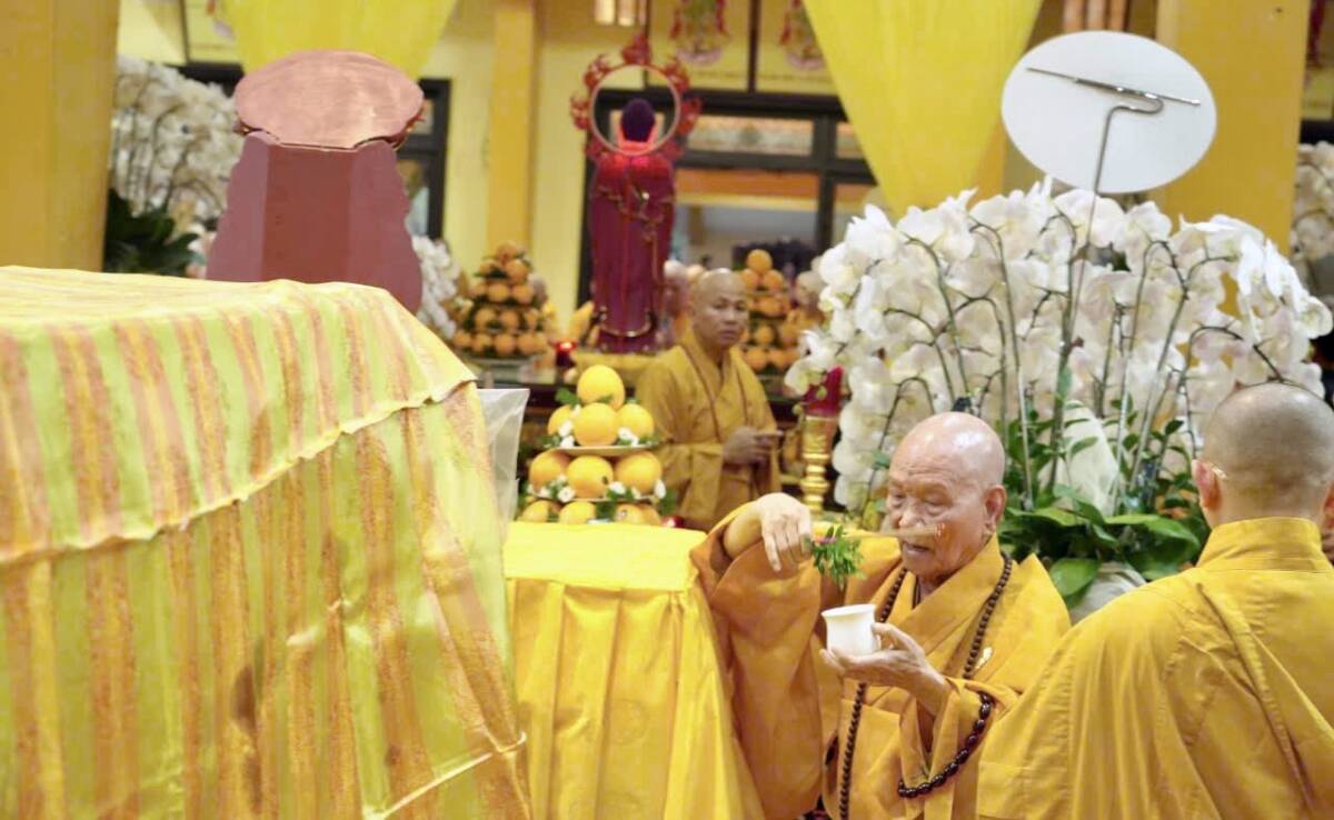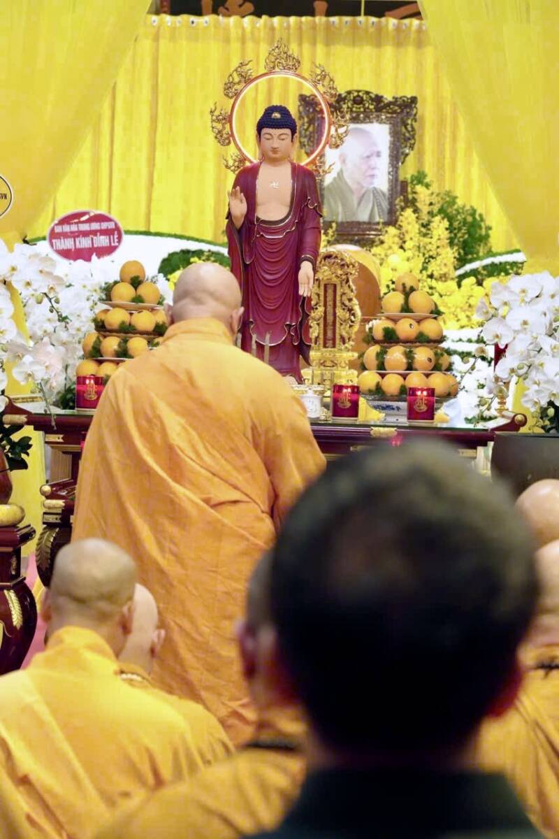 Hòa thượng Thích Lệ Trang, Phó Chủ tịch Hội đồng Trị sự, Trưởng ban Nghi lễ T.Ư, Trưởng ban Trị sự GHPGVN TP.HCM đương vi Sám chủ, cùng chư Tôn đức Ban Kinh sư thực hiện nghi thức nhập kim quan.