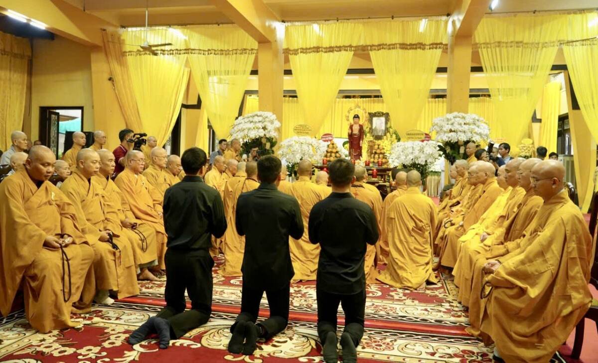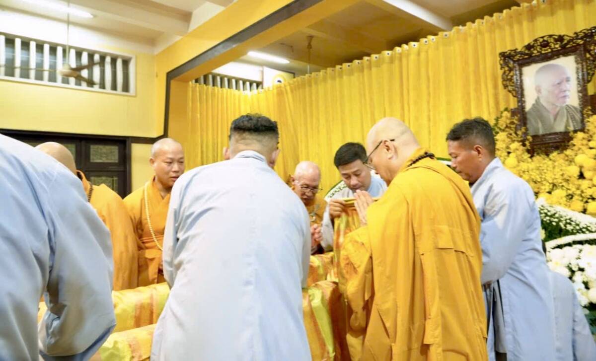 Tiếp đó, Hòa thượng Sám chủ cùng chư Tôn đức Ban Kinh sư cử hành khóa lễ thỉnh Giác linh Trưởng lão Hòa thượng an vị, môn đồ pháp quyến thọ tang Ân sư theo truyền thống thiền môn.