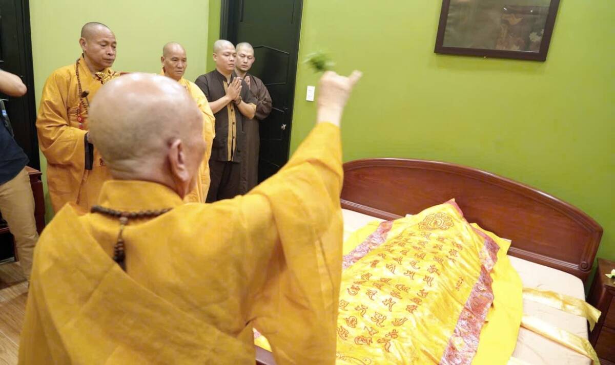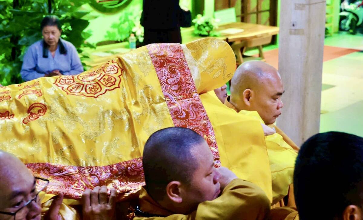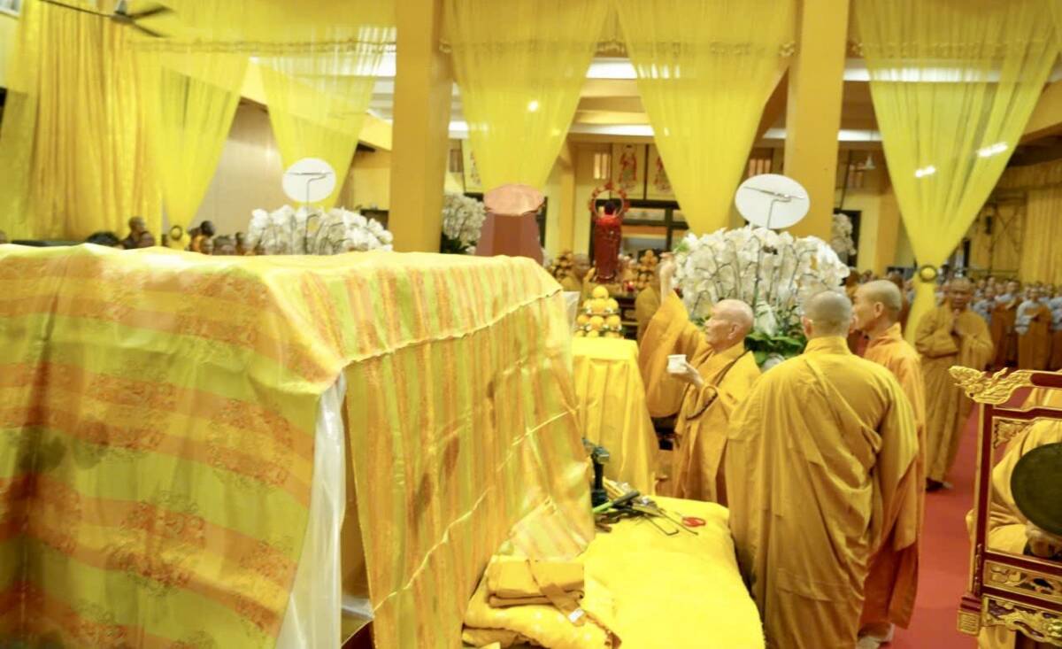 Trong tiếng trì tụng Đại Bi, Thập Chú của toàn thể hội chúng, môn đồ pháp quyến cung thỉnh nhục thân Trưởng lão Hòa thượng rời liêu phòng, hướng về Giác linh đường nhập kim quan.