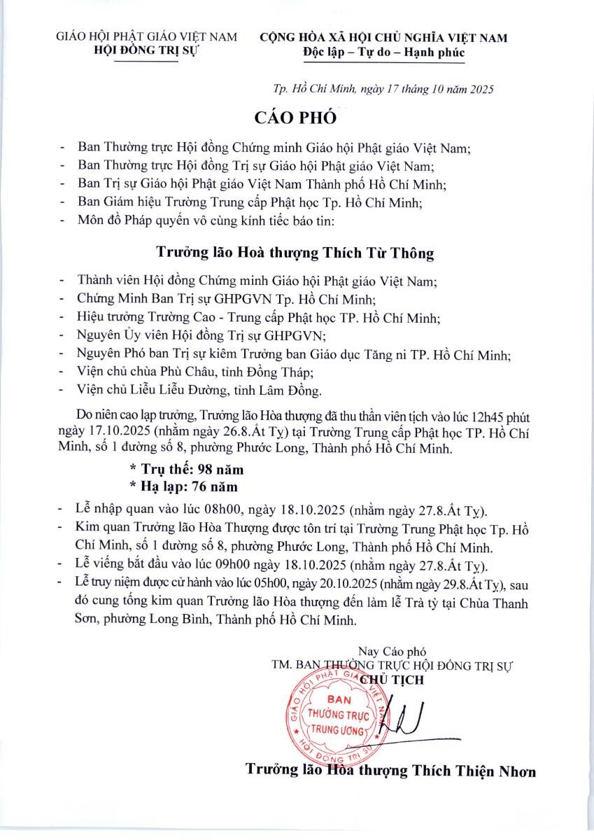 PGĐS – Trưa ngày 17 tháng 10 năm 2025 (nhằm ngày 26 tháng 8 năm Ất Tỵ), thay mặt Hội đồng Chứng minh và Hội đồng Trị sự Giáo hội Phật giáo Việt Nam, Trưởng lão Hòa thượng Thích Thiện Nhơn, Phó Pháp chủ Hội đồng Chứng minh, Chủ tịch Hội đồng Trị sự GHPGVN, đã ấn ký Cáo phó, thành kính thông tri: