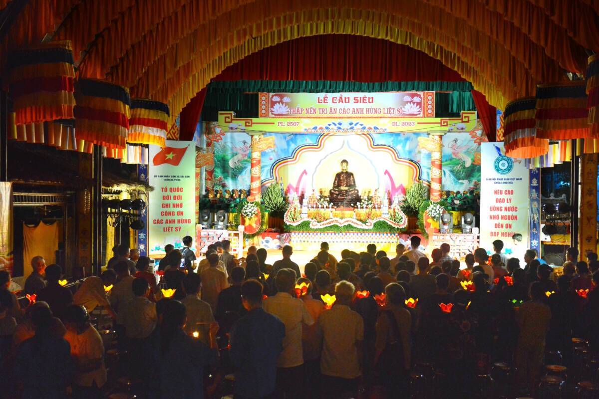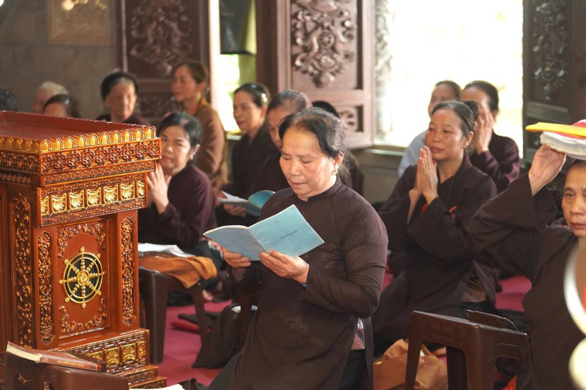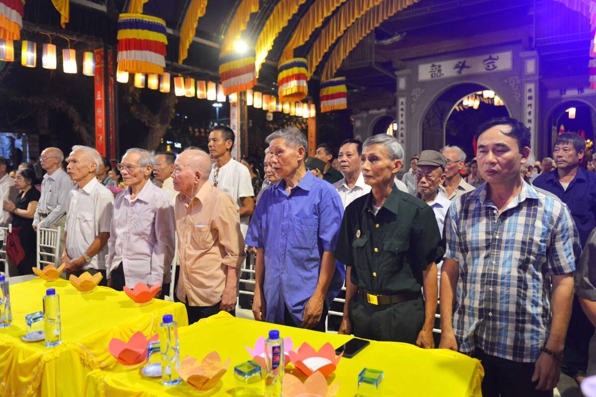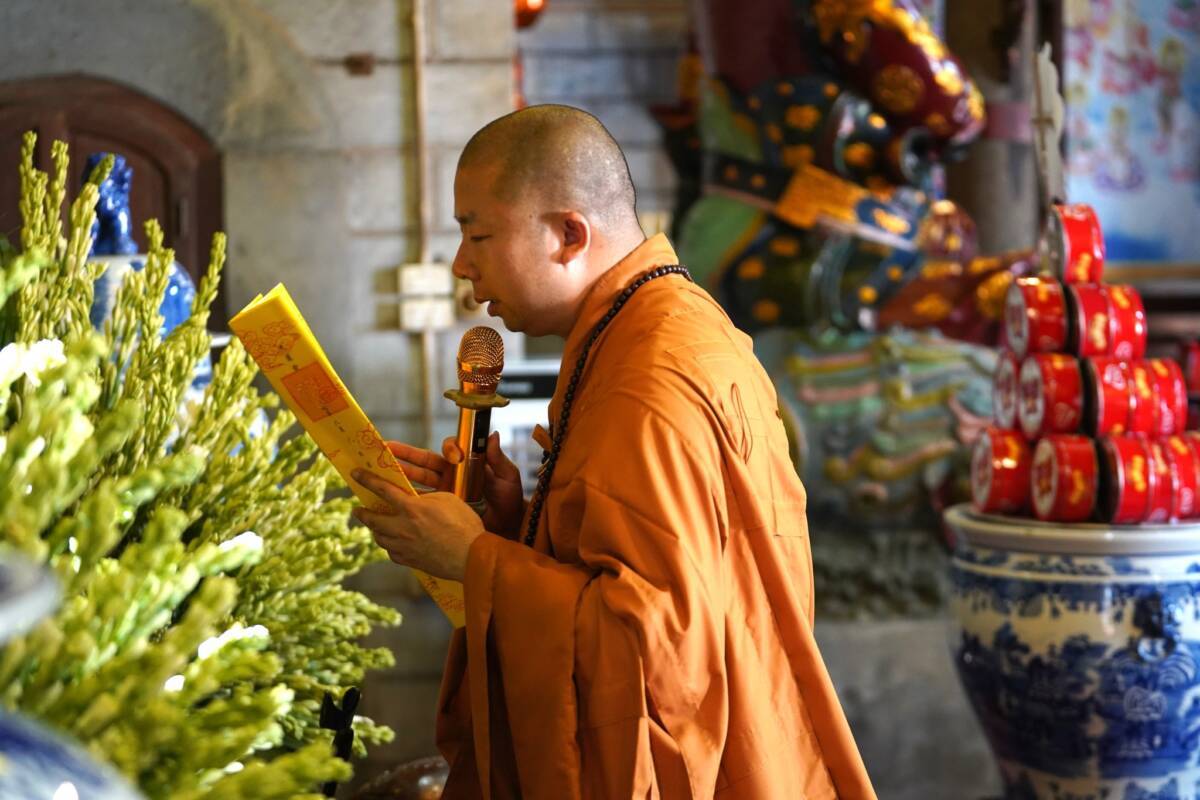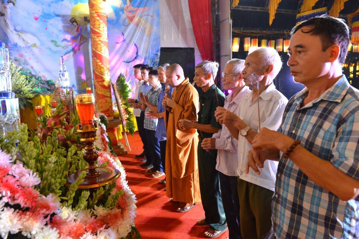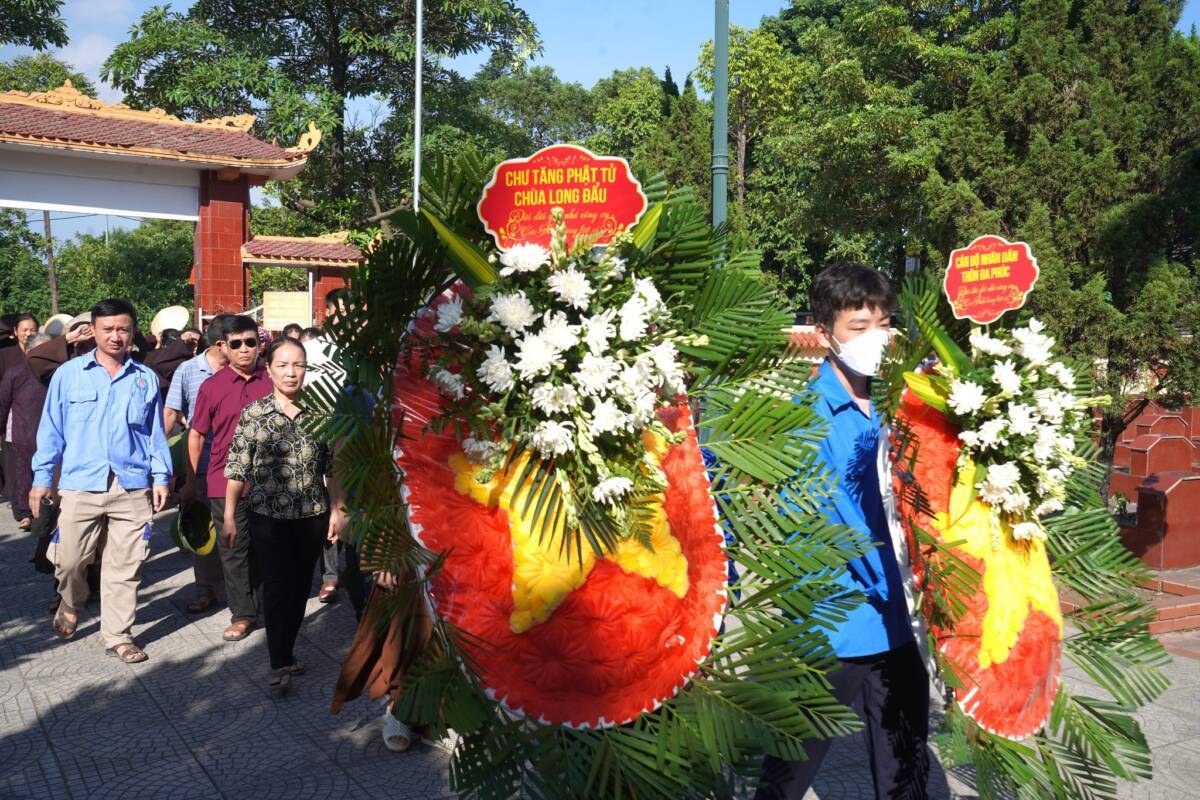 Trong không gian tôn nghiêm, linh thiêng chùa Long Đẩu, đúng 14h, tiếng chuông, tiếng mõ cầu siêu vang vọng mở đầu cho buổi lễ. Chủ lễ – Đại đức Thích Đạo Khuê là người dẫn nhịp. Đạo tràng thành kính, trang nghiêm, một lòng hướng về đức Phật từ bi. Lời kinh tiếng kệ tâm thành dẫn lối cho anh linh các anh hùng liệt sĩ, đồng bào tử nạn về với Long Đẩu tự lễ Phật, lạy Phật, trở về nước Phật. Hương thơm của nhang, ánh sáng của đèn, nến, sắc rực rỡ của hoa hòa cùng niềm thành kính của đạo tràng khiến buổi tụng niệm càng trở nên trang trọng và ý nghĩa.