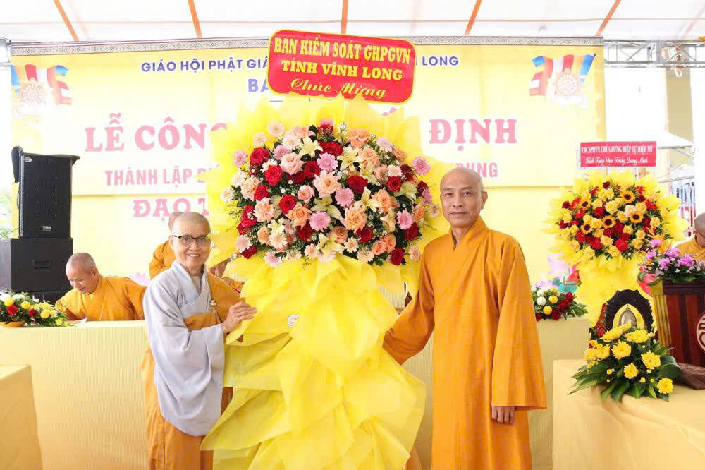 Quang lâm chứng minh, tham dự buổi lễ có HT.Thích Tâm Linh, HT.Thích Phước Minh, HT.Thích Viên Minh – đồng Chứng minh Ban Trị sự GHPGVN tỉnh Vĩnh Long (BTS PG); HT.Thạch Sok Xane – Phó Chủ tịch HĐTS, Trưởng BTS kiêm Trưởng ban Tăng sự PG tỉnh; Chư Tôn đức Phó Ban Trị sự, ủy viên Thường trực Ban Trị sự; chư Tôn đức Tăng Ni quý Phật tử. Đại diện các ban ngành hữu quan cùng tôn giáo bạn cùng tham dự chúc mừng.
