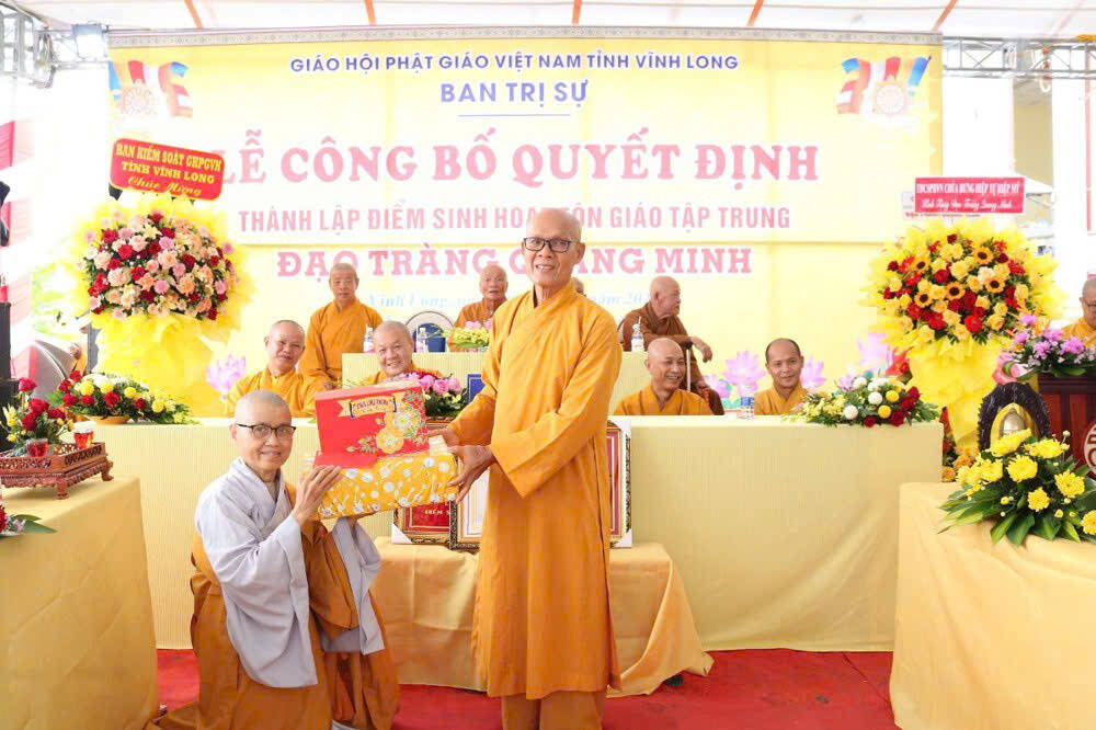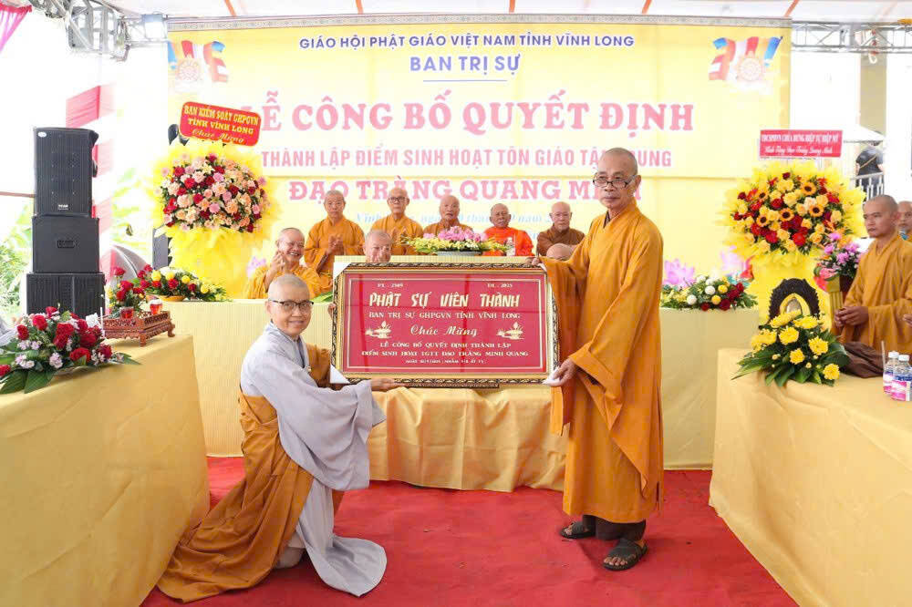 PGĐS- Sáng nay, ngày 30/9/2025 (nhằm ngày 9 tháng tám năm Ất Tỵ) Ban Trị sự GHPGVN tỉnh Vĩnh Long đã long trọng tổ chức Lễ công bố Quyết định thành lập Điểm sinh hoạt Tôn giáo tập trung Đạo tràng Quang Minh tại ấp Giồng Dài, xã Hiệp Mỹ.